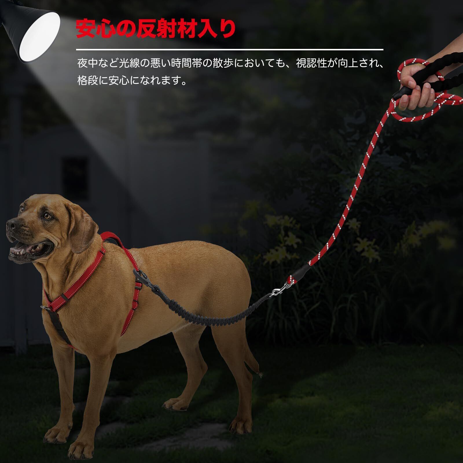 【反射材入りのリードロープ】出品の大型犬 リードは耐摩耗性の高いポリエステルを素材とし、丸ロープの形で、摩擦に強くて絡みにくいタイプです。犬リード長い本体にもバンジーリードにも、反射糸が縫い込まれ、車などのライトに照らされると反射し、遠くからはっきりと見えます。夜中など光線の悪い時間帯の散歩において、視認性が向上され、格段に安心になれます。