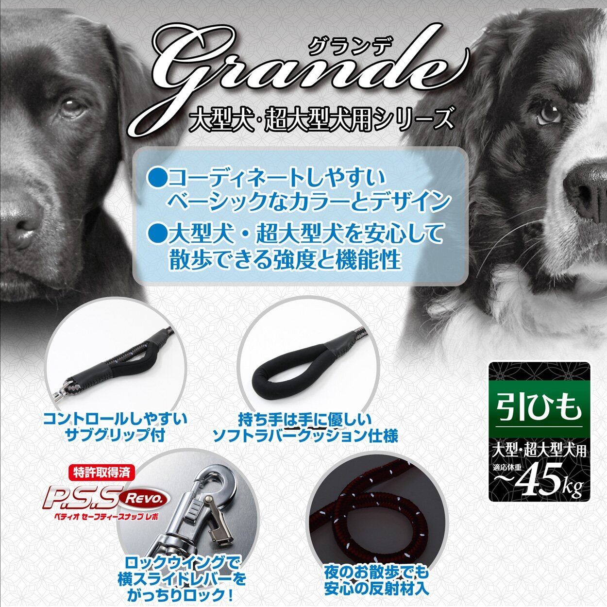 大型犬・超大型犬用の犬具。コントロールしやすいサブグリップや、手に優しいソフトラバークッション仕様の持ち手で散歩中の負担を和らげます。夜の散歩に便利な反射材入。P.S.S REVO.搭載!