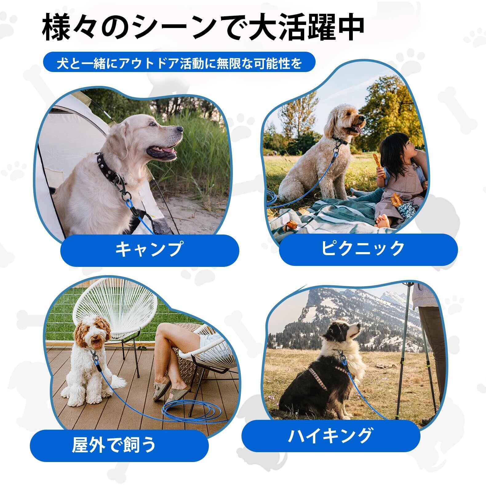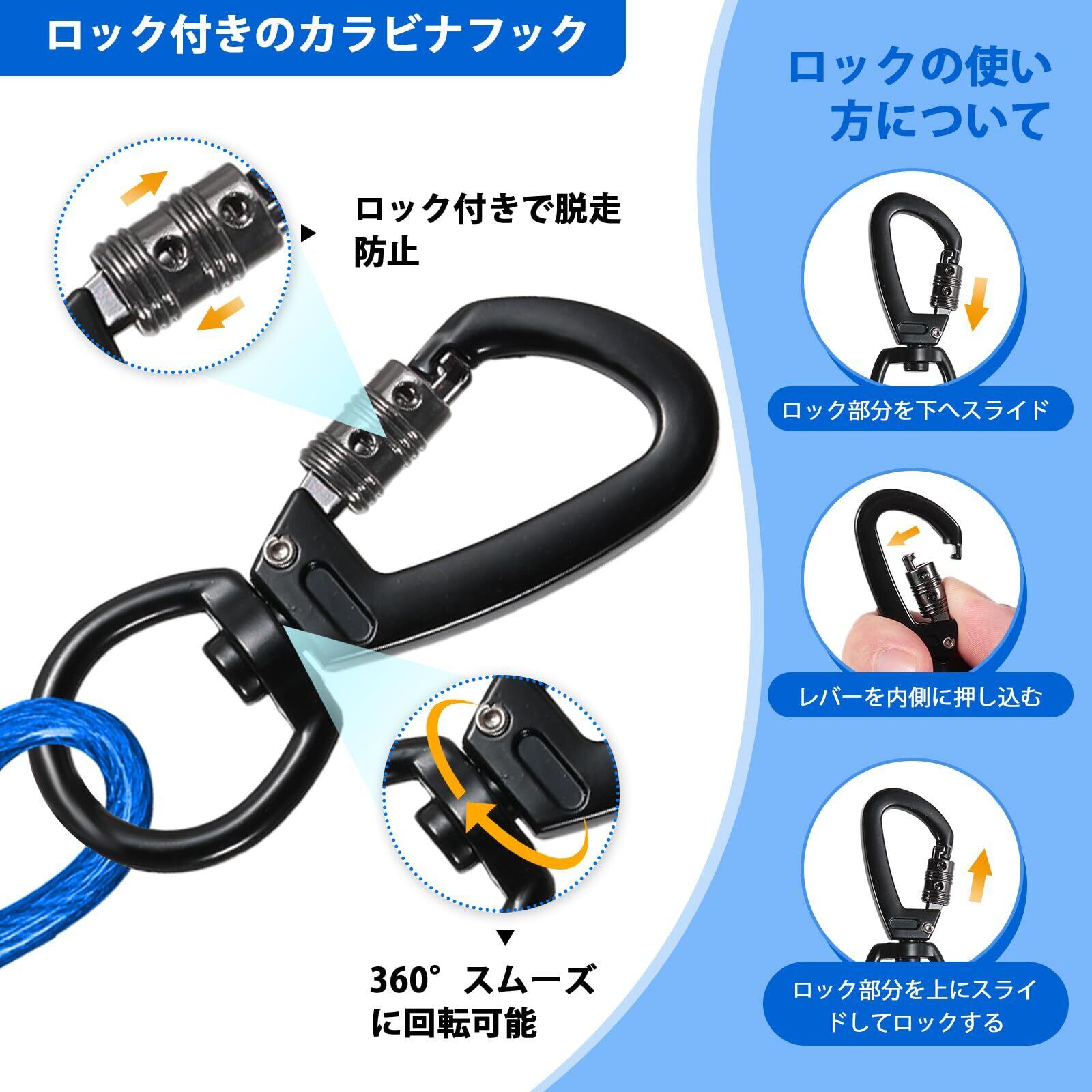 【取付・使用が簡単】安全ロック付きのカラビナは、木や杭に結んだり、ポールやステッキに繋いだり、犬リードを腰に繋げて愛犬と散歩や遊びをしたりと、さまざまな使い方があります。さらに、犬リードワイヤー本体が軽くて持ち運び便利であるために、公園へのレジャー、キャンプ、ハイキングなどのときに愛犬を連れて行く場合もサポートします。ペットを目に届く範囲で自由に動かさせるのは飼い主さんも安心します。