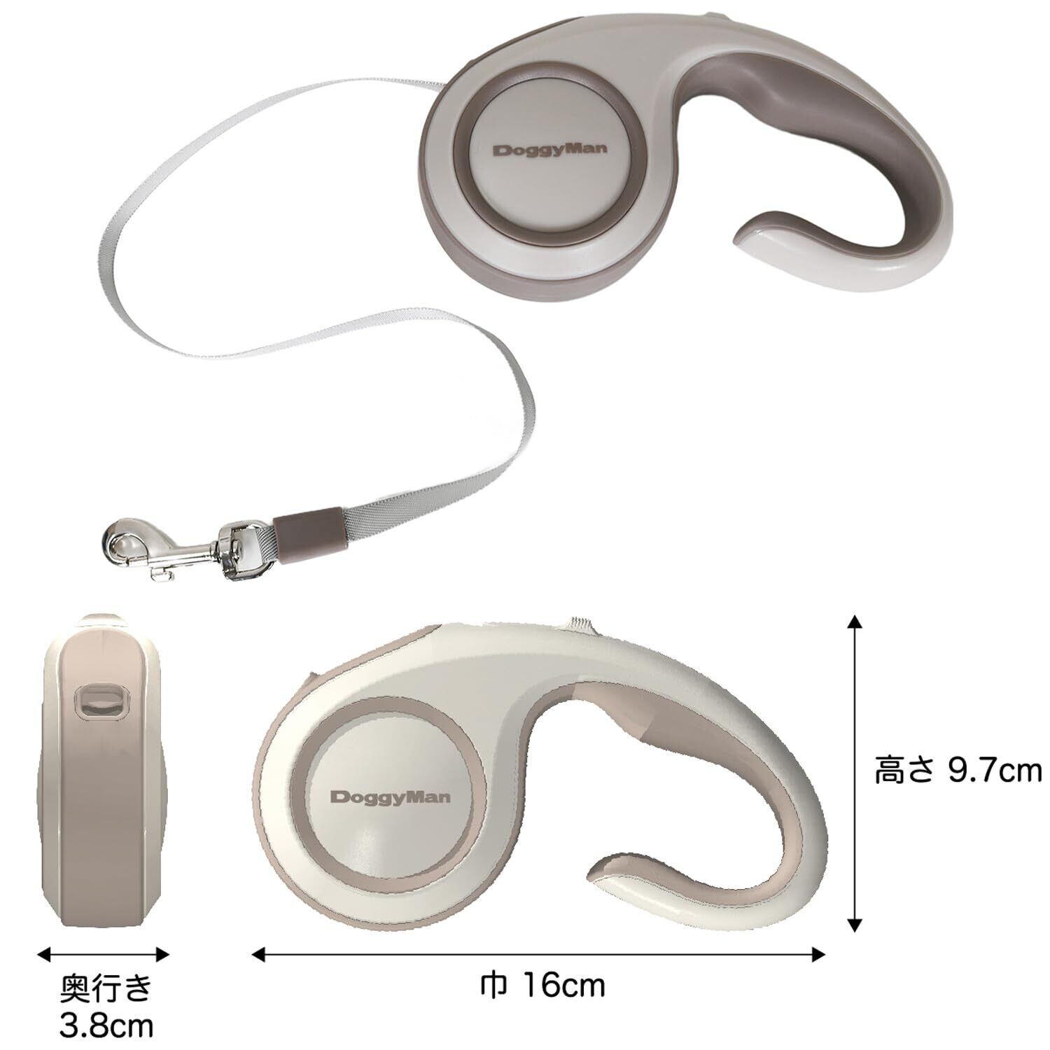 ●本体サイズ幅16×高さ9.7×奥行3.8cm 重量約170g。ポケットにも入るコンパクトさで持ち運びも便利。対象10kg以下、リード長さ最大3m。