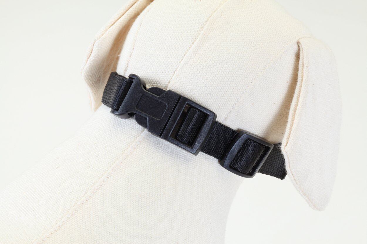 1図のように本品の先端が短い方を上にワンちゃんのくち先にまっすぐはめます。2頭の後ろ側でサイズを調節し、フィットしているかを確認してからバックルを留めます。ワンちゃんのくちが少し開いて呼吸できるようにベルトの長さを調節してください。
