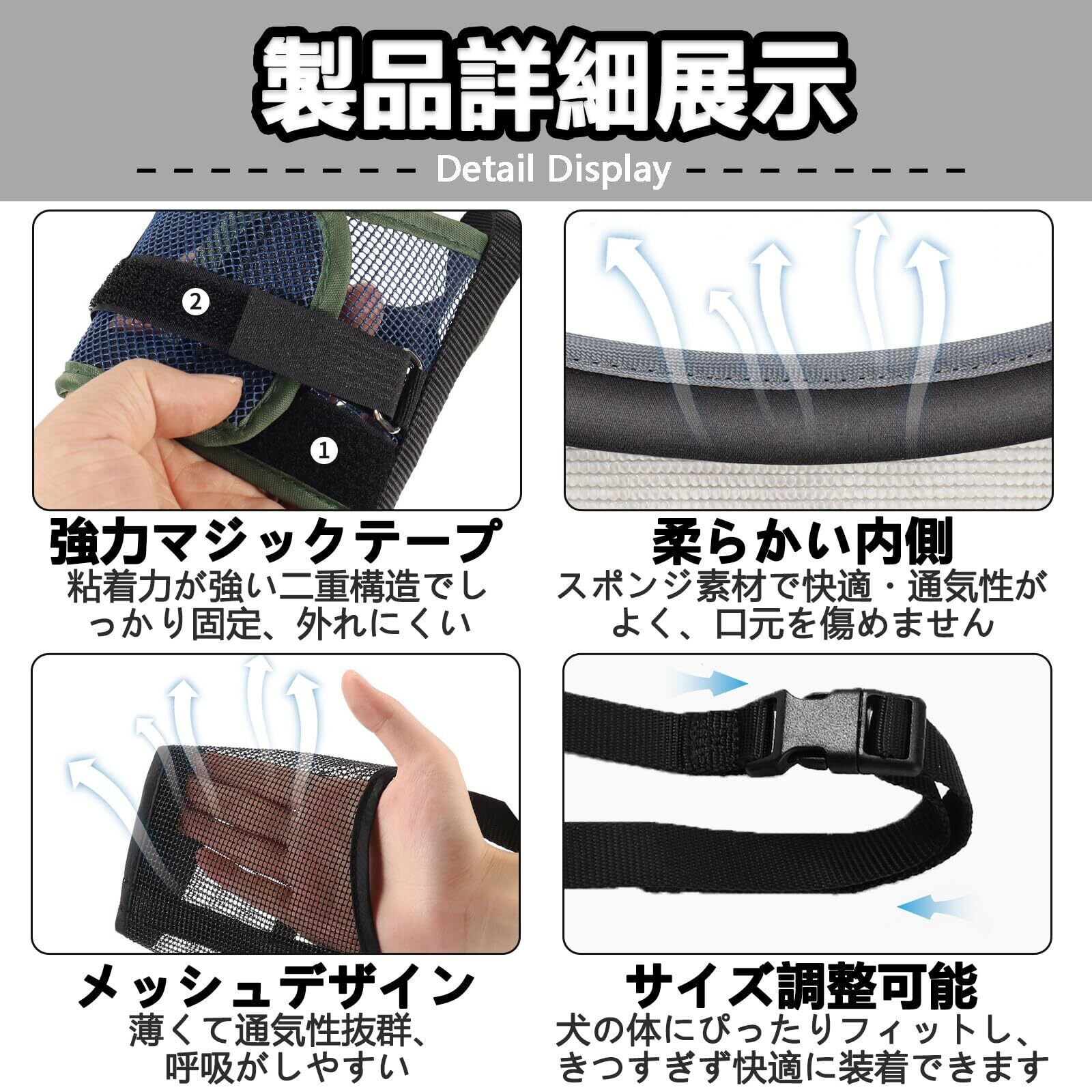 【安定装着&快適設計】本製品は縦横2方向に配置された高粘着の二重強化マジックテープ構造により、走行中や頭を振った際のズレをしっかり防止します、さらに、口元にはU型のカーブデザインを採用しており、顎の動きを妨げず自然な装着感を実現、縁部分にはクッション材を縫い込むことで、長時間の使用でも圧迫感を抑え、愛犬にやさしいフィット感を提供します