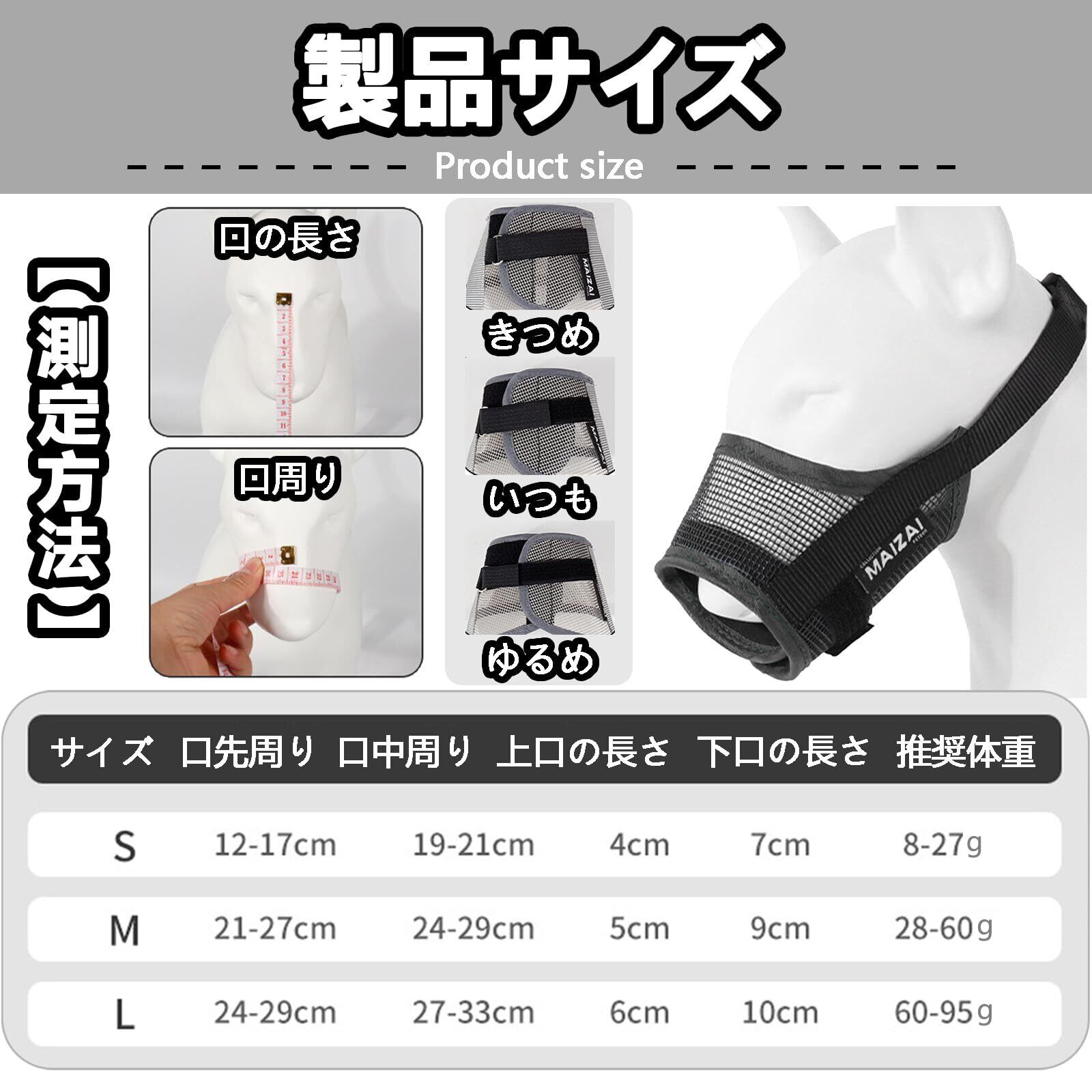 【犬 口輪】3 段階サイズで幅広い犬種対応: S(8-25g)/M(26-60g)/L(60-95g)の 3 サイズ展開。中型犬(柴犬・ボーダーコリー)から大型犬(ゴールデンレトリバー・シベリアンハスキー)まで快適フィット