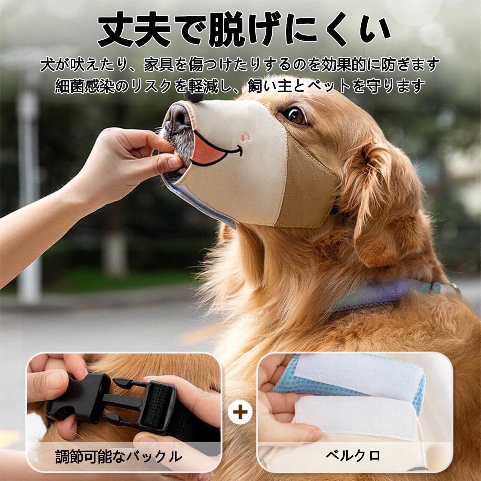 【調節可能&しっかり固定】 犬の口輪には強力なマジックテープとワンタッチバックルを採用。頭周りに合わせてサイズ調整ができ、しっかりフィットしズレにくい設計です。愛犬の安全を確保しながら、散歩やトレーニングをより快適に行えます。