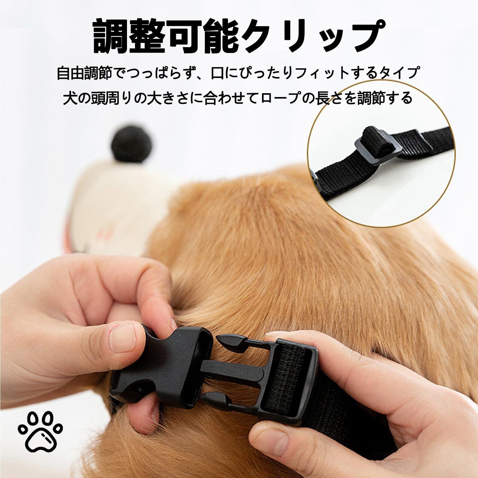 サイズを愛犬の口周りに合わせて選び、頭周りにマジックテープとバックルで調節して装着してください。無理なく動ける状態を保ちつつ、ずれないようしっかり固定します。使用後は汚れを手洗いで落とし、乾燥させてください。