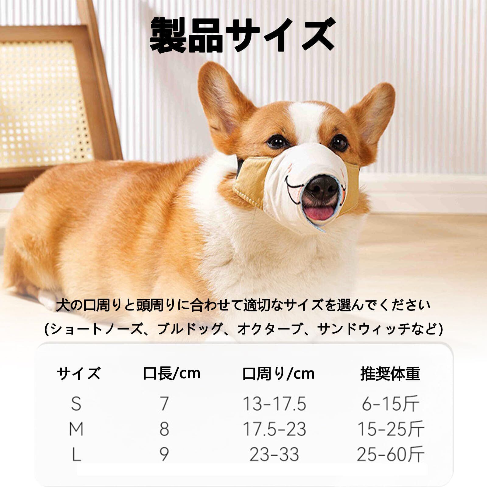 【サイズ展開あり】犬用マズルはS/M/Lの3サイズをご用意。愛犬の体型に合わせてお選びください。Sサイズ:口周り約13~17.5cm、口の長さ7cm(3~7.5kgの犬向け)。Mサイズ:口周り約17.5~23cm、口の長さ8cm(7.5~12.5kgの犬向け)。Lサイズ:口周り約23~33cm、口の長さ9cm(12.5~30kgの犬向け)。※ 短吻犬(フレンチブルドッグ、パグ、シャー・ペイなど)には適していません。愛犬の口周りと頭周りを測定し、適切なサイズをお選びください。
