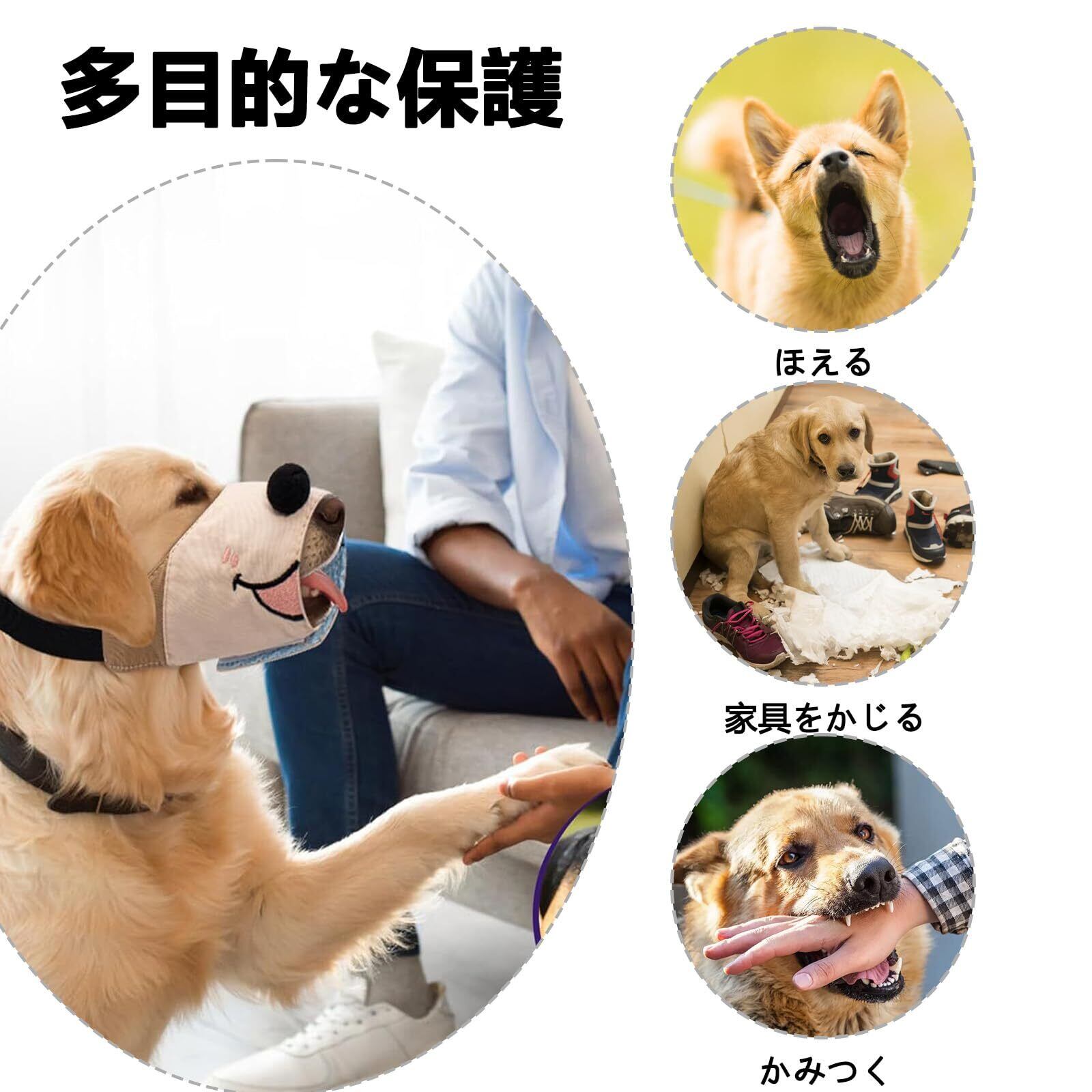 散歩時やトレーニング、獣医受診、旅行時など幅広い場面で活躍。過度な吠えや噛みつきを抑えたいとき、傷口の保護や家具の破損防止にも適しています。愛犬との安心で快適な生活をサポートします。
