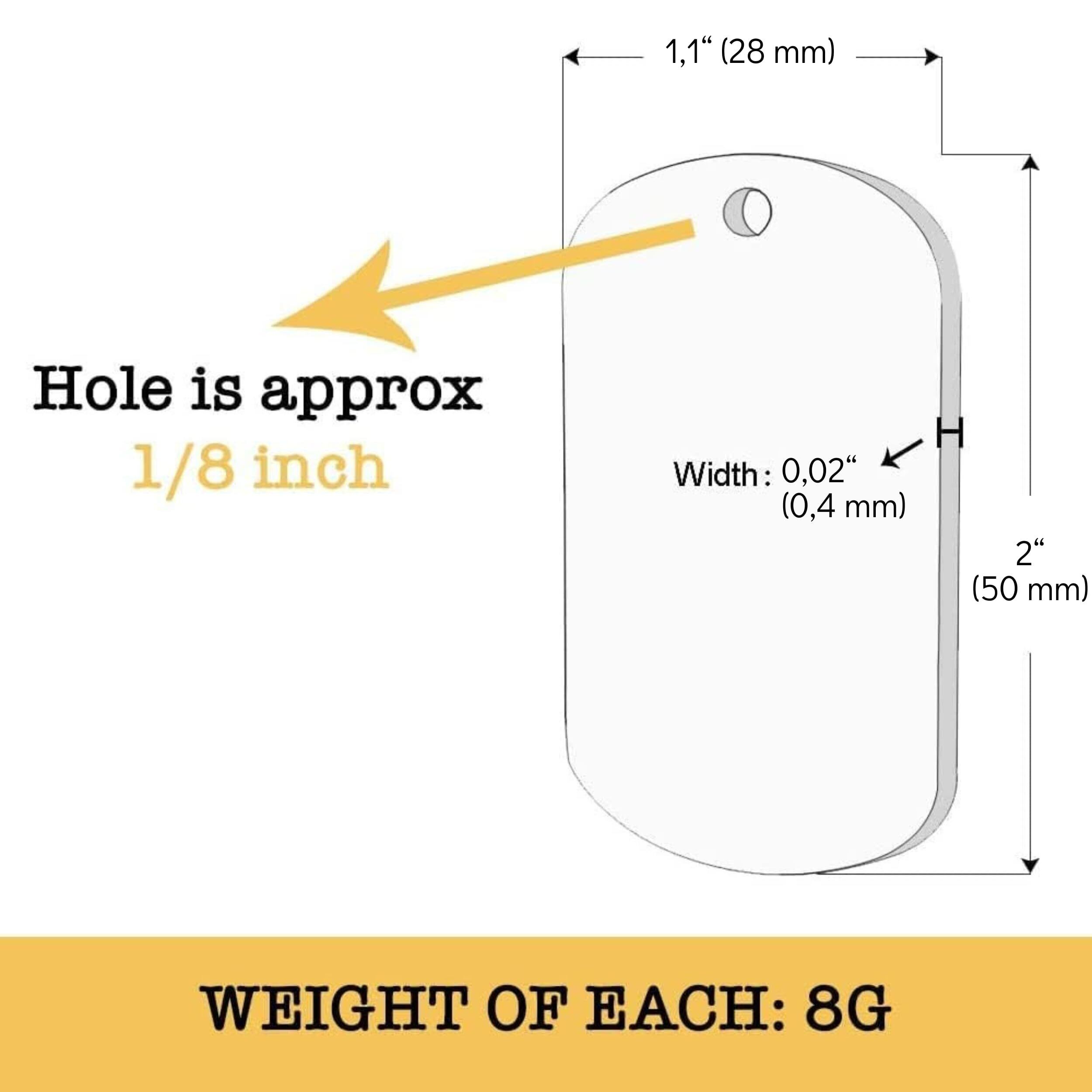 標準ミリタリー寸法: 高さと長さ1.125インチ x 2インチ、穴の直径: 1/8インチ (#3ボールチェーンに最適)。