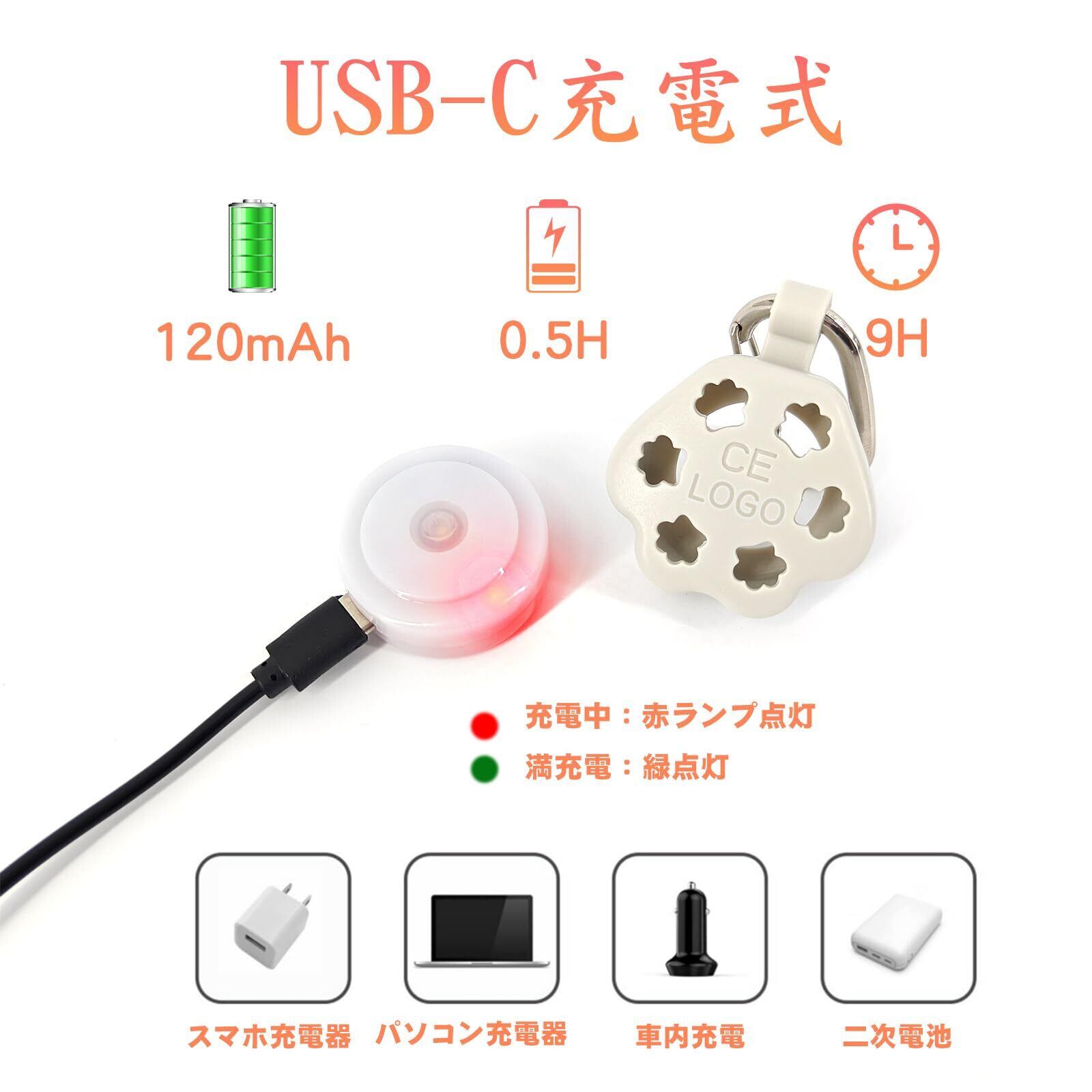 長寿命バッテリーと USB 充電可能: このライトには 120 mAh 容量のバッテリーが付属しており、最大 9 時間の動作時間があり、マイクロ USB ケーブルを使用して 0.5 時間で完全に充電できます。