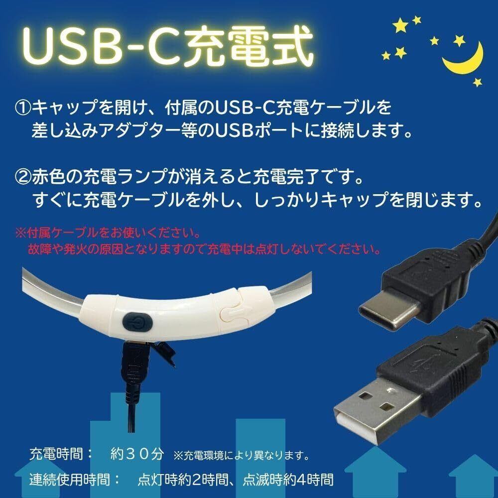 【ご使用前に】 1.サイズ調整 ①接続部を外し、カットシール側のネジを+ドライバーで外します。 ②ペットの首周りサイズに少し余裕をもたせ、クリアチューブのカット位置にテープを巻き、その上から真っ直ぐにハサミでカットします。 ※どの位置でもカット可能ですが、カットすると元には戻せませんので、首周りサイズをしっかり確認してください。 スイッチ側のネジを外すと破損の恐れがありますのでご注意ください。 ③カット後は接続部を本体に取付けて+ドライバーで垂直に力を込めネジで留めます。 ※ネジの紛失にご注意ください。+ドライバーは付属しておりません。 2.充電方法 ①キャップを開け、付属のUSB-C充電ケーブルに差し込みアダプター等のUSBポートに接続します。 ※不足ケーブルをお使いください。故障や発火の原因となりますので充電中は点灯しないでください。 ②赤色の充電ランプが消えると充電完了です。 すぐに充電ケーブルを外し、しっかりキャップを閉じます。 【使用方法】本品は充電式の為、充電後ご使用ください。 ①接続部を外し、愛犬の首やバッグ等に装着します。 ②ON/OFFスイッチを押して点灯。押すたびに、早い点滅→遅い点滅→点灯→消灯の順に変ります。