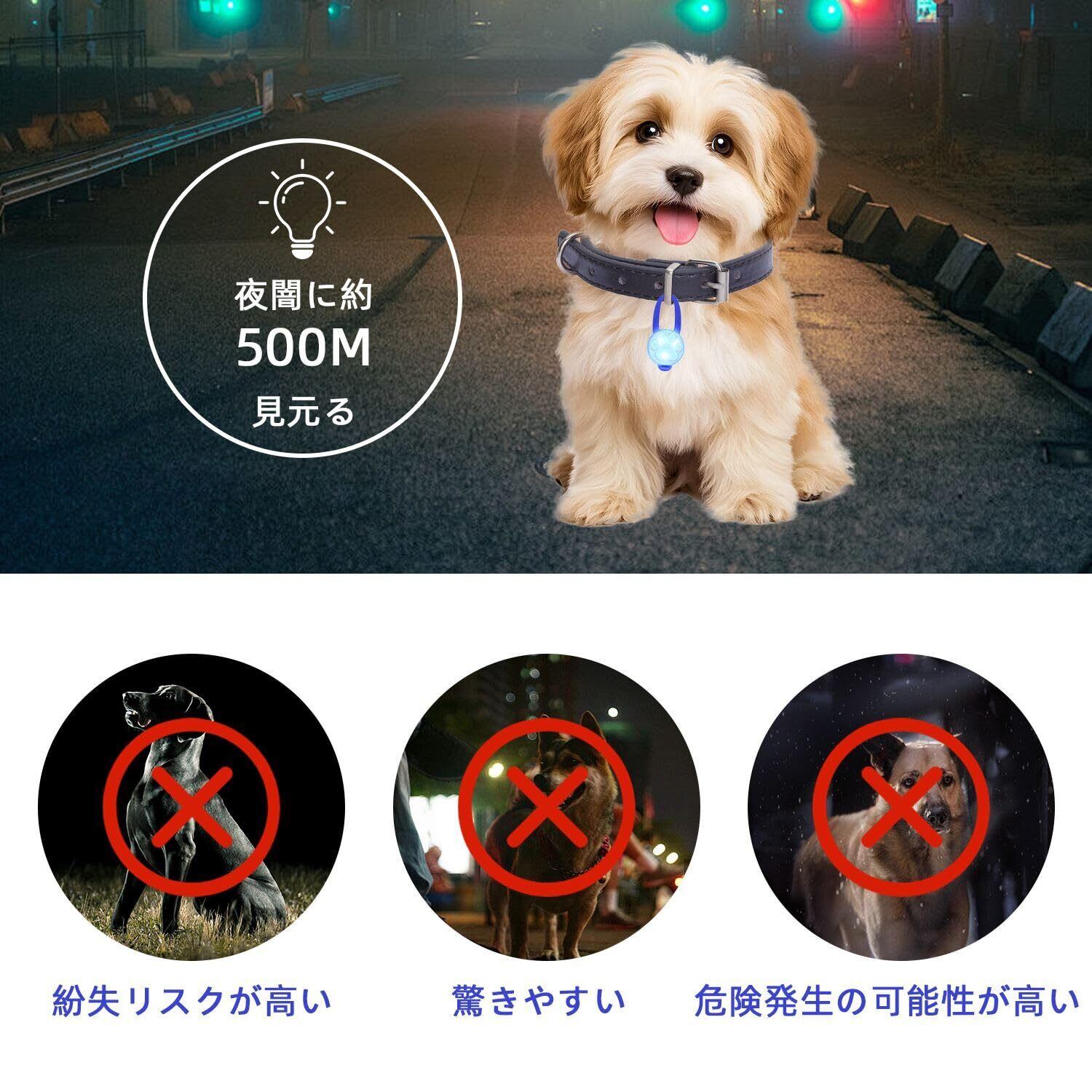 【安全性の高いペットライト】ペットの首輪ライトは、犬の位置を追跡し、喪失を防ぎ、挫傷を防止するために設計されています。夜間でもペットの安全性を向上させます。