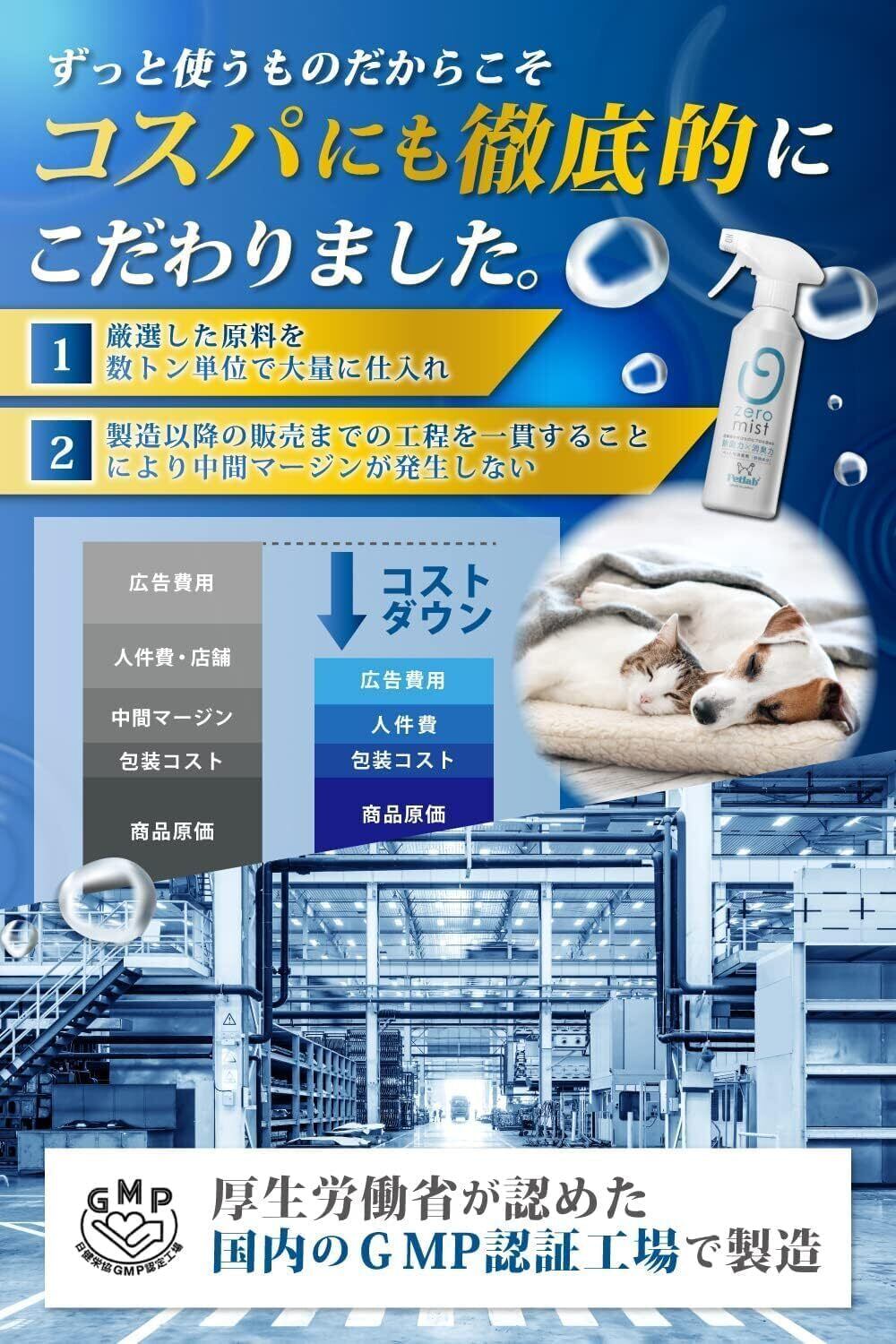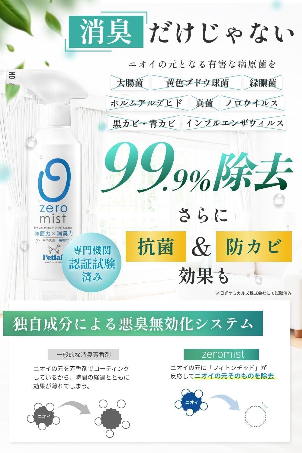 【ご確認ください】本品は天然成分100%のオーガニック処方であるため、保管状況や環境によっては澱または酵母(無菌カビ)が発生する可能性がございます。 メーカーにて菌検査を実施しており、これらの物質が人体やペットの体に害を及ぼすものではないことは確認されておりますが、ご使用を中止いただき店舗までご連絡くださいませ。無償にて新品と交換させていただきます。 【動物看護士×トリミングサロンとの共同開発】Zeromistはニオイが気になるソファーやカーペット、ペットのトイレまわり、洋服やリードなど、幅広い箇所に使用可能な消臭スプレーです。また、犬・猫だけでなく爬虫類、観賞魚などにも効果的です。毎日使うものだからこそ“家族・ペットへの安全性”にこだわり、何度も試作を重ね、化学成分ゼロ・無臭で、強力消臭・除菌ができる消臭剤を実現しました。