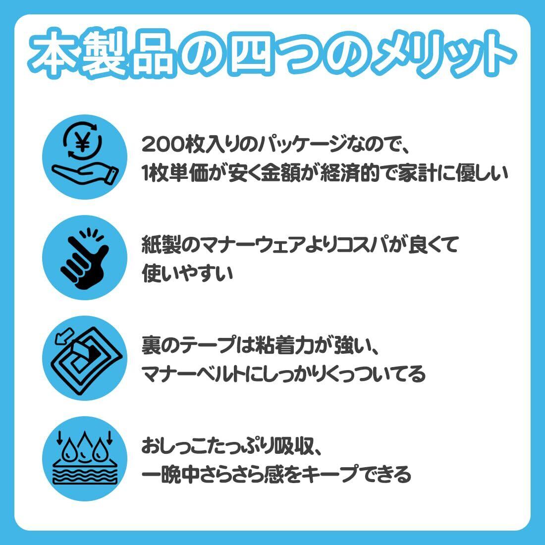 【お得な大容量セット】200入りのパッケージなので、1枚単価が安く金額が経済的で家計に優しい!また、他のメーカーさんと比べれば負けない質を提供することをお約束します。紙製のマナーウェアよりコスパが良くて使いやすいです。まだマナーパッドを使ったことのない方がぜひ本製品を試してください。