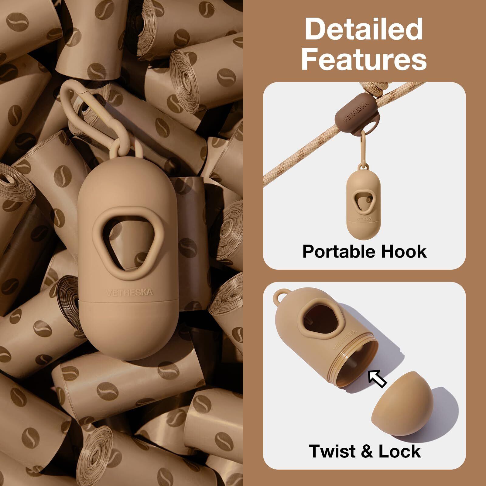 VETRESKA ペット用ウンチ処理袋 ぽいたくんうんち袋と取り出し容器 犬うんち袋 防臭袋 猫 トイレ 袋 臭いが漏れない 生分解性 猫砂用廃棄物袋 サニタリー 袋 お出かけの携帯ゴミ袋 コーヒーの香りつき消臭袋 (7ロール 105枚+1 ディスペンサー)