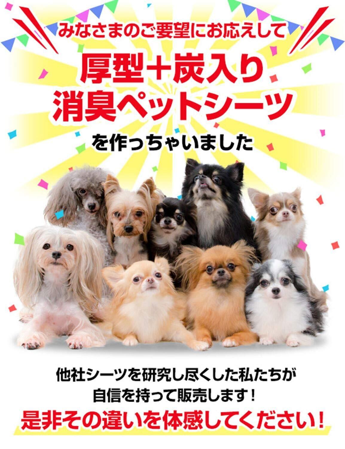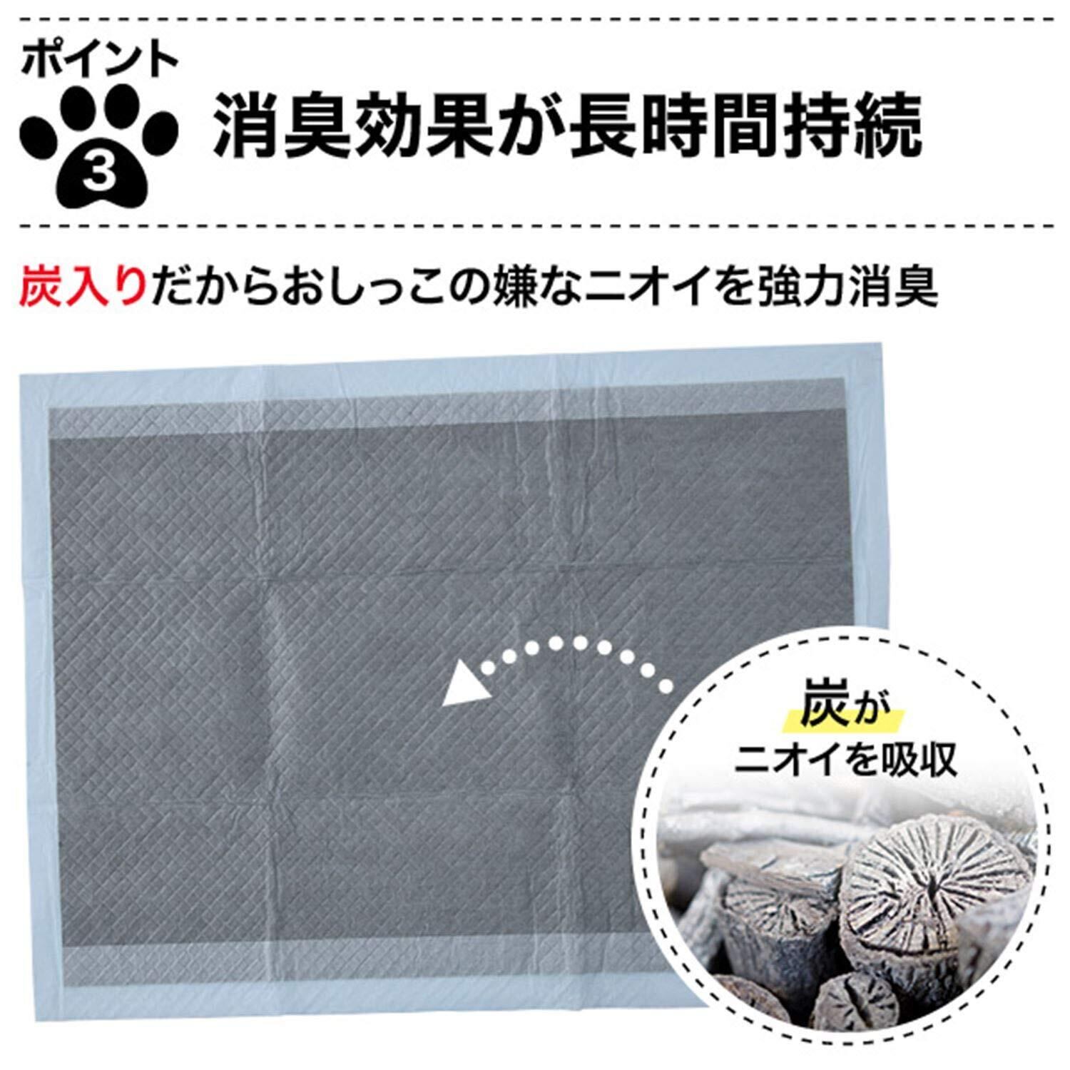 【厚型×炭入り】厚型で吸収力が高く、炭入りで消臭効果に優れたペットシーツです。長時間留守にすることが多い、頻繁にシーツを変えられない、ニオイが気になる、という方にオススメです。