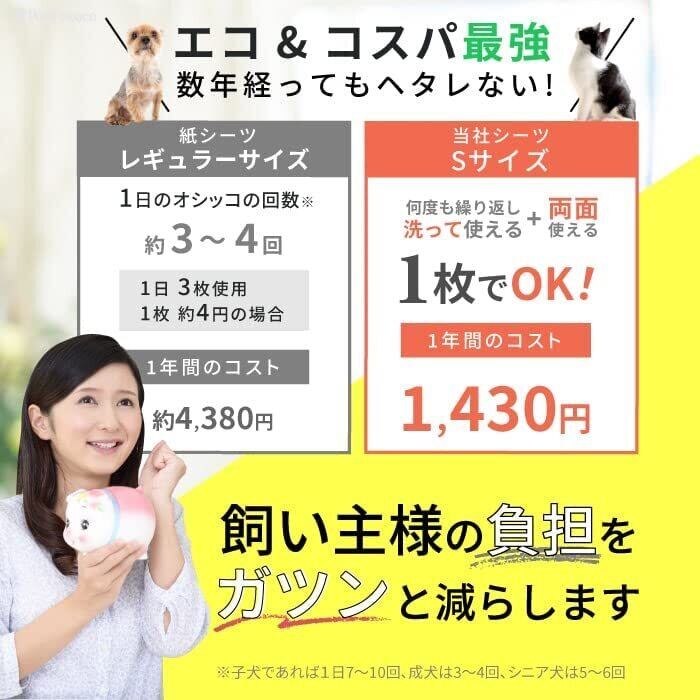 ◆使用環境 ・ペットシーツ3枚(洗替えローテーションのため) ・1日に1枚使用しその後「洗濯→乾燥→保管」のローテーション ※概ね1枚を週に2回洗っている感じとなります(単純計算で1枚を月10回ほど洗っていることになりますね)。 スタッフは、この使用方法で1枚を最長約5年間ほど使用しており、経年劣化で吸収力が弱まったかな?匂いがとれないな。。。と感じたときに洗替えを補充購入してます。