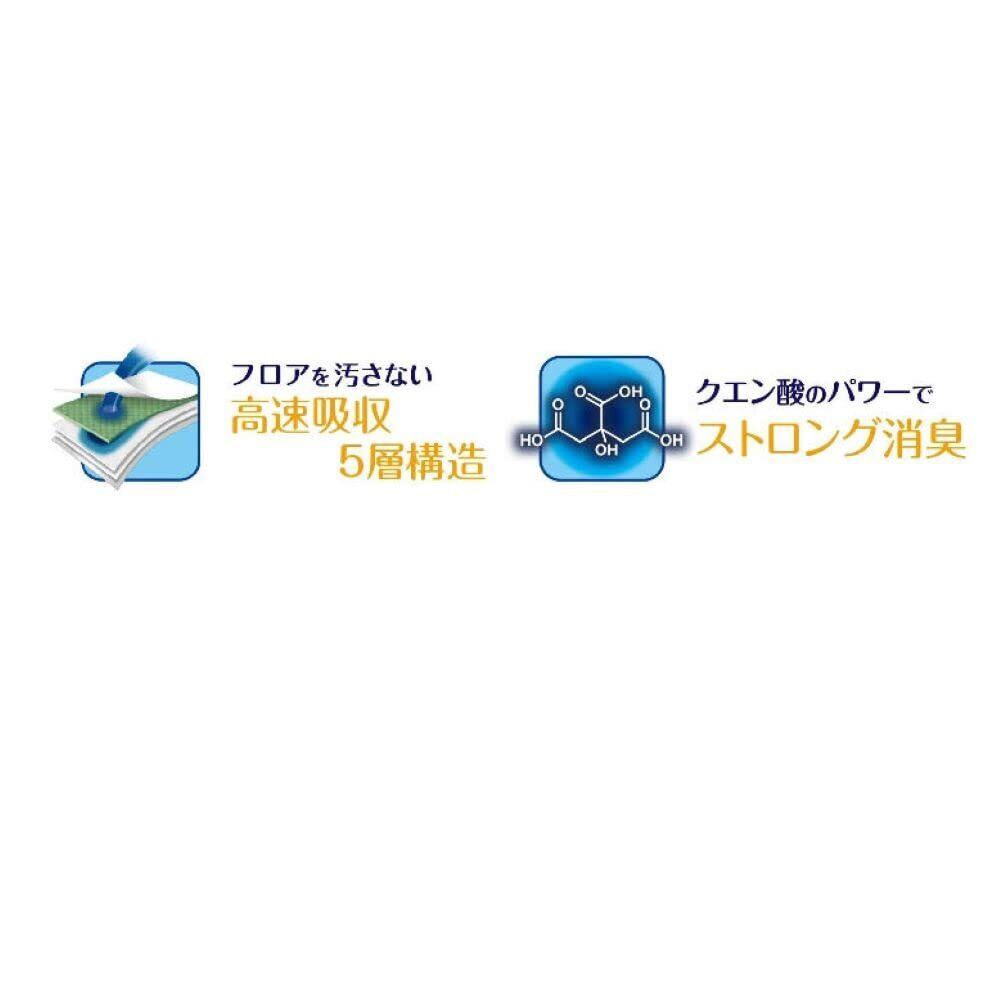 ●高速吸収のための5層構造 たっぷりオシッコを吸収するため、リビングを快適に保ちます。 ●クエン酸のパワーでストロング消臭 クエン酸を配合している為、オシッコのイヤな臭いを消臭します。 ●高機能不織布でオシッコも目立たない 表面材に高機能不織布エアスルーを使用することにより、触り心地が柔らかく、オシッコを吸収した後のサラサラ感がUPしました。