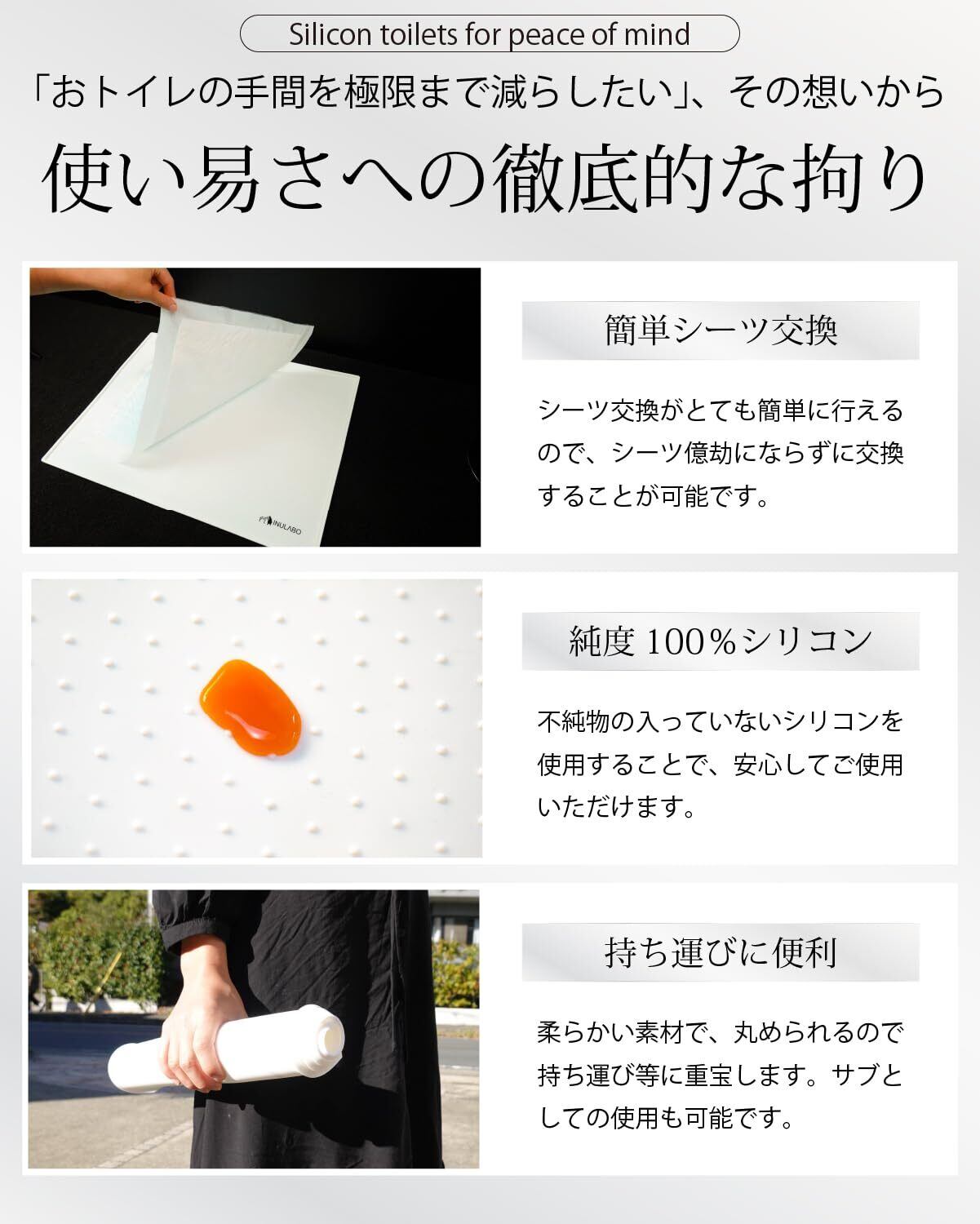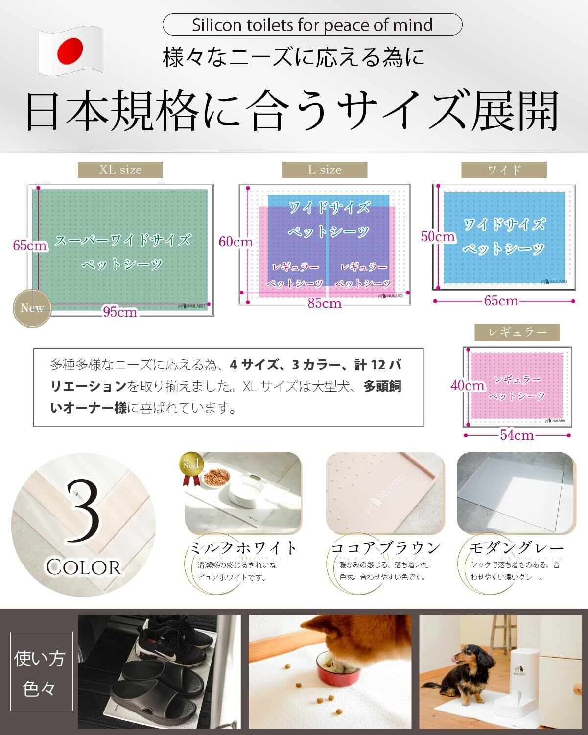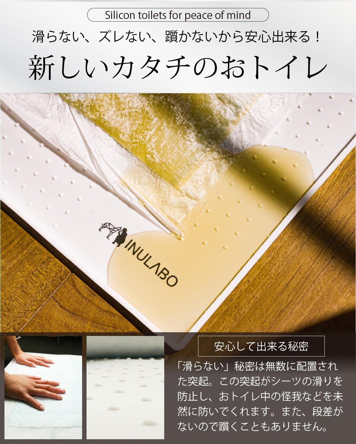 【いつまでも一人でできる】シリコントイレ は、薄型トイレなので段差が少なく、滑らない、新しいカタチのおトイレです。フラットな形状なので、躓くことなく、ズレることなく、滑らないトイレなので、高齢犬や老犬 、足の弱い子、仔犬にはとっても重宝します。また、超小型犬?大型犬まで、メッシュが苦手なワンちゃんにも是非使って頂きたい一品です。