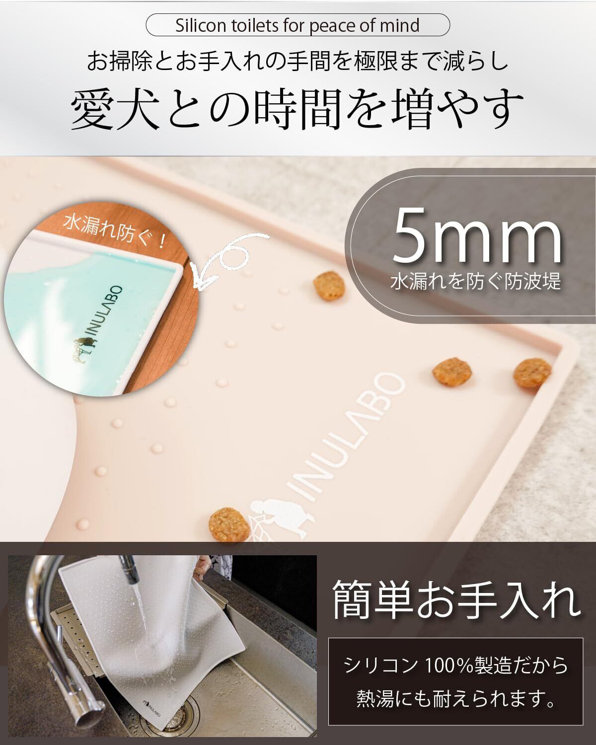 【こだわりのデザイン】縁には漏れ防止の土手を施しています。約5mmととても高い作りの為、簡単には漏れたりはしません。また、無数に張り巡らされた凹凸はシーツがずれにくいデザインに仕上がっています。凹凸は最適なサイズを採用。右下には「INULABO」のロゴをあしらい、非常に洗練されたデザインに仕上がっています。