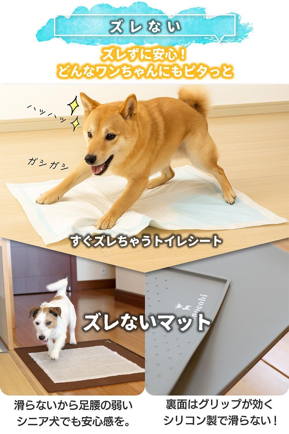 【滑らないから、やんちゃな子犬〜シニア犬までおすすめ】 滑り止め加工付きで、犬用トイレシートが滑らないシリコントイレマット(ペットトイレ)。ついぐちゃぐちゃになりがちなトイレシートもピッタリ密着するします。高エッジ設計だから、ちょっとぐらいはみ出しても全然OK!足腰の弱ったシニア犬にも最適です。食品グレードシリコンを使用しているため、食事用のペットマットとして使用でき、食べこぼしの気になる大型犬用の防水マットとしても使える犬用トイレトレーです。