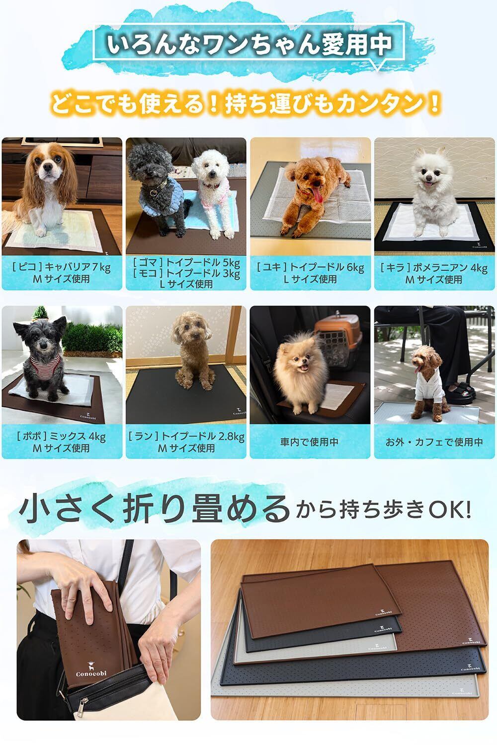 【小さく折り畳んで持ち運びOK】小さく折りたためる犬用トイレだから、バッグに入れて公園やカフェなど、お出かけにもお使いいただけます。Lサイズもあり、旅行先でも使えるペットマット。犬トイレトレーとして室内でも屋外でも大活躍です。プラスチックのトイレトレーに比べ、軽量で持ち運びしやすいおしっこマットは、旅行先でも洗って使用でき清潔。犬用マットとして一枚あると、便利な防水マットです。