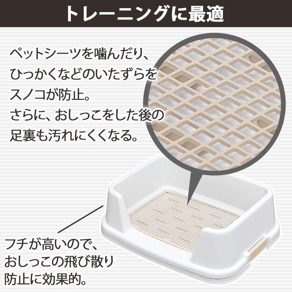 【商品説明】:かわいいマカロンカラーで新登場。トイレトレーニングに最適な犬トイレです。シーツの上にスノコを取り付けて使用することで、犬がシーツをひっかいて破いたり、食べたりすることを防止します。通常の犬トイレに比べて壁やフチが高いので、愛犬がトイレを覚えやすく、おしっこの飛び散り防止にも効果的です。トイレトレーニングが終わればスノコを取り外して通常のトイレとして使用することができます。シーツのヨレやシワを抑えるバックルが付きです。銀イオンで臭いの元となる菌の発生を抑制します。 ●適合シーツサイズ: ワイドサイズ(44×59cm)