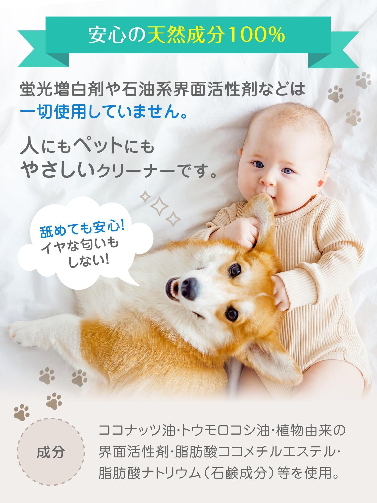 【ペットに安心】天然原料のみで作られた洗剤。蛍光増白剤や石油系界面活性剤などが入っていないのでペットに安心。