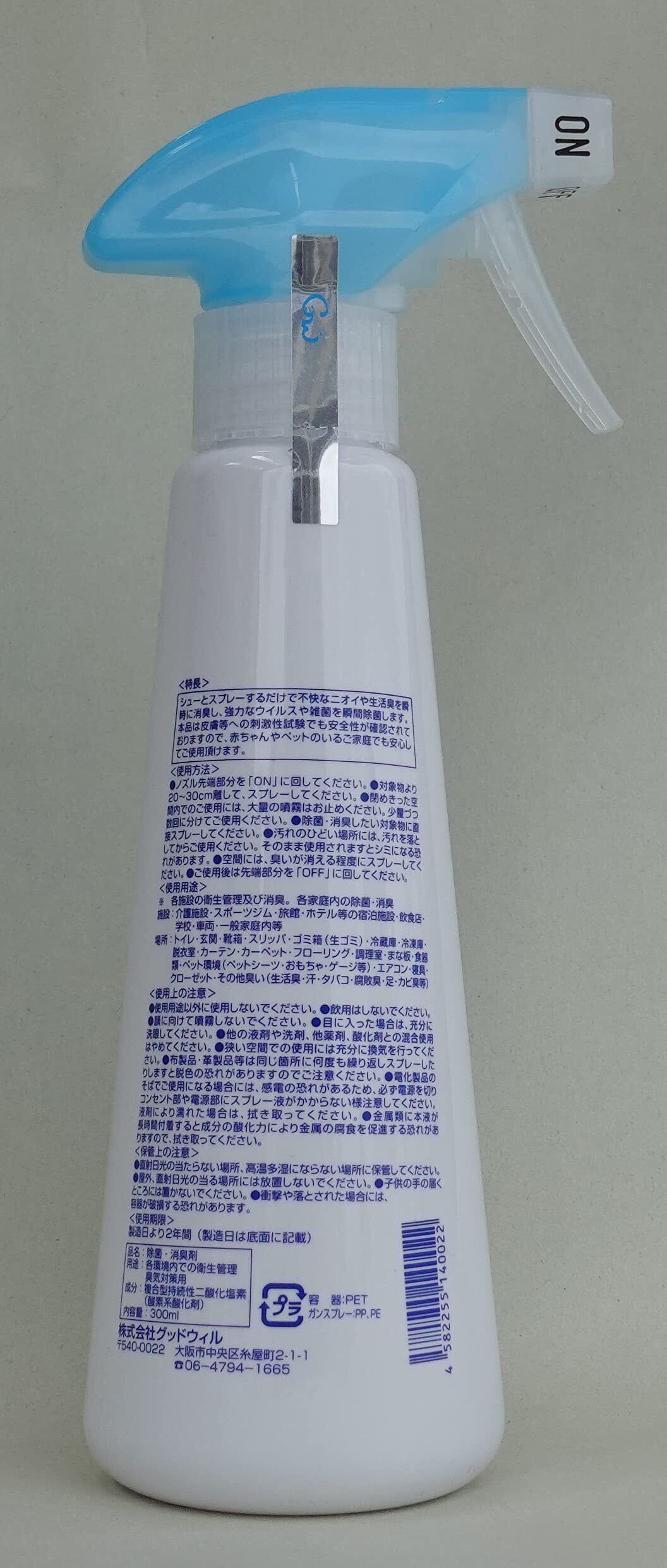 ・使用用途以外に使用しないでください。 ・飲用はしないでください。 ・顔に向けて噴霧しないでください。 ・安全性は確認されていますが、目に入った場合は、充分に洗眼してください。 ・他の液剤や洗剤、他薬剤、酸化剤との混合使用はやめてください。 ・狭い空間での使用には、充分に換気を行ってください。 ・布製品・革製品等は同じ場所に何度も繰り返しスプレーしたりしますと変色・脱色の恐れがありますのでご注意ください。 ・電化製品のそばでご使用になる場合には、感電の恐れがあるため、必ず電源を切りコンセント部や電源部にスプレー液がかからない様注意してください。 液剤により濡れた場合には、必ず拭きとってください。 ・金属類に本液が長時間付着すると成分の酸化力により金属の腐食を促進する恐れがありますので、拭きとってください。