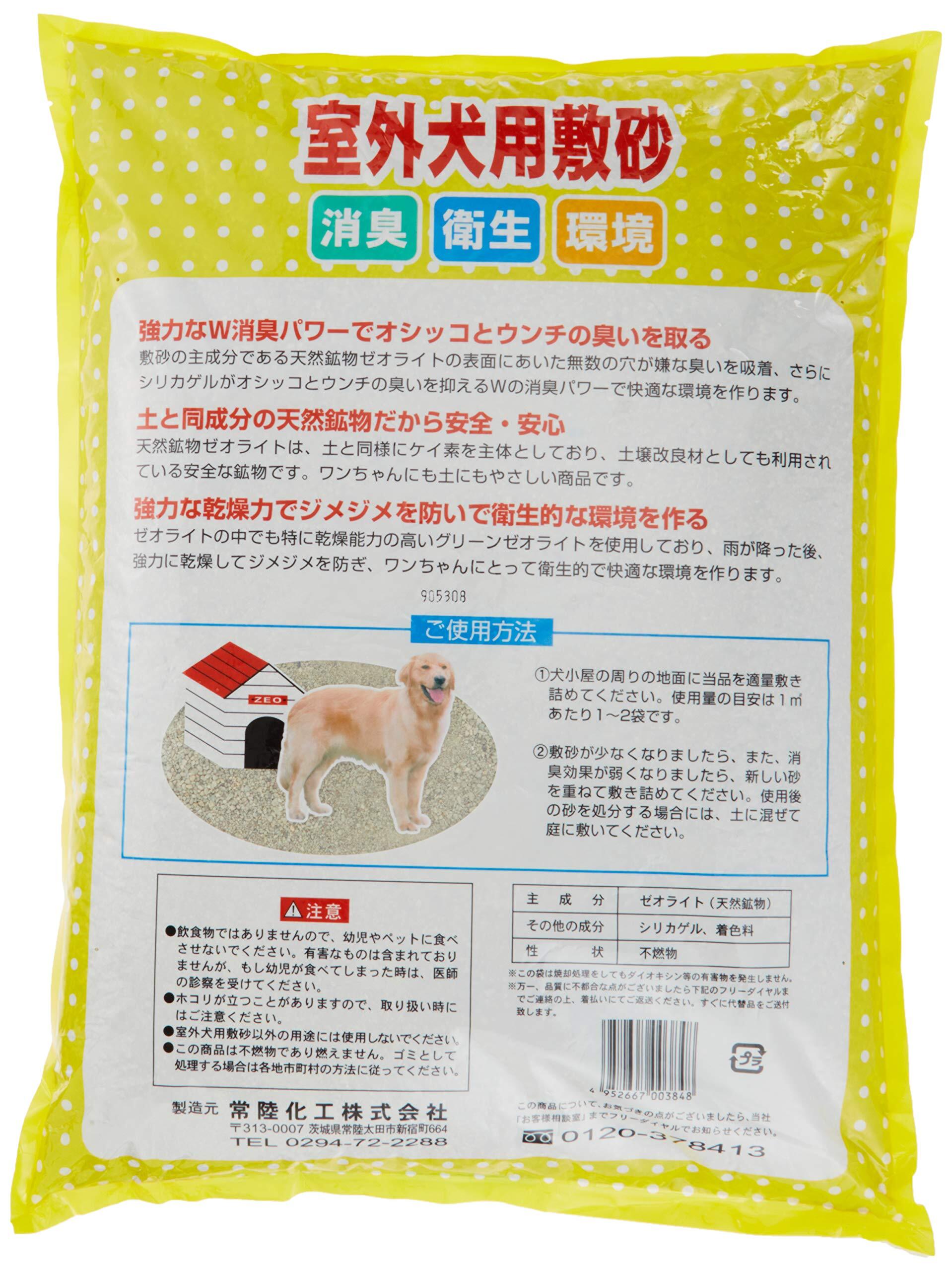 消臭・衛生・環境にやさしい! 犬小屋の周りにまいて、室外犬の快適環境を創る敷き砂です。敷砂の主成分である天然鉱物ゼオライトの表面にあいた無数の穴が嫌な臭いを吸着、さらにシリカゲルがオシッコとウンチの臭いを抑えるWの消臭パワーで快適な環境を作ります。天然鉱物ゼオライトは、土と同様にケイ素を主体にしており、動物の整腸作用があり、飼料添加剤や土壌改良材としても利用されている安全な鉱物です。ワンちゃんにも土にもやさしい商品です。ゼオライトの中でも特に乾燥能力の高いグリーンゼオライトを使用しており、雨が降った後、強力に乾燥してジメジメを防ぎ、ワンちゃんにとって衛生的で快適な環境を作ります。
