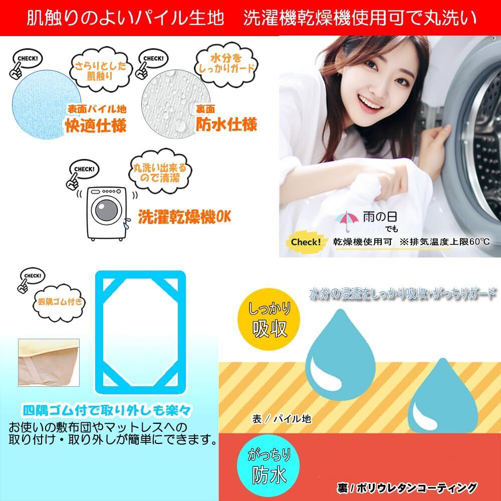 フラット防水シーツの[専門店]がお届けする[2層構造]の防水シーツです。性能・品質とリーズナブルな価格を両立しました。おねしょやトイレトレーニング、寝汗や吐き戻し、介護時など、お布団やマット汚れのお悩みを解決します。表面は優しい肌触りのループパイル生地(タオル生地)裏面は防水コーティング素材で水分をしっかりガードします。また、ポリエステル100%のパイル生地は天然繊維と比較して乾きやすいのが特徴です。パッケージや広告費などの無駄を省き、質実剛健※な防水シーツな防水シーツシーツに仕上げました。【質実剛健】…まじめで飾り気がなく、たくましくしっかりしていること。
