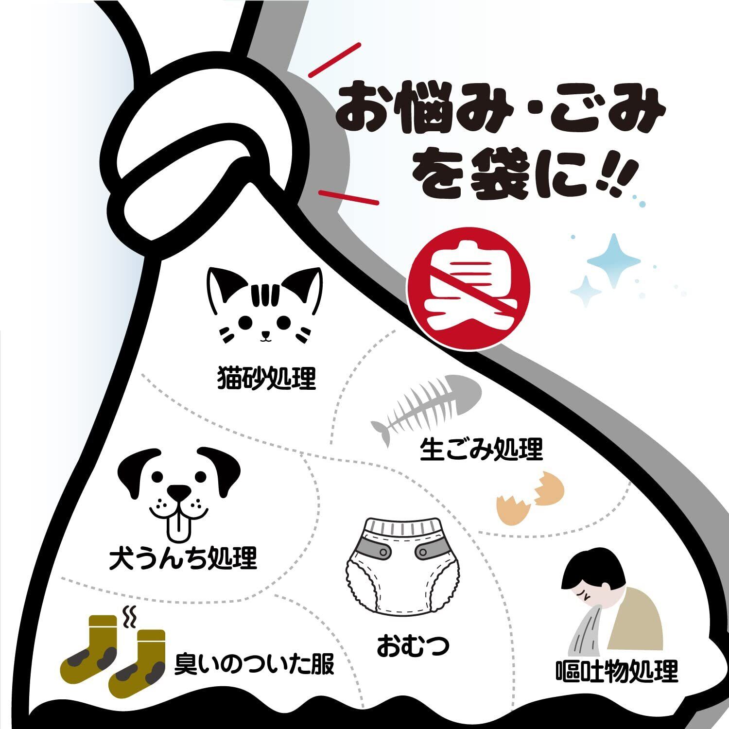いろいろな場合で:ペットの汚物始末用や赤ちゃん・大人のおむつ処理だけでなく、乗り物酔いの嘔吐物、キムチのように匂いが移りやすい食品の保存などいろいろな場合で役立ちます。