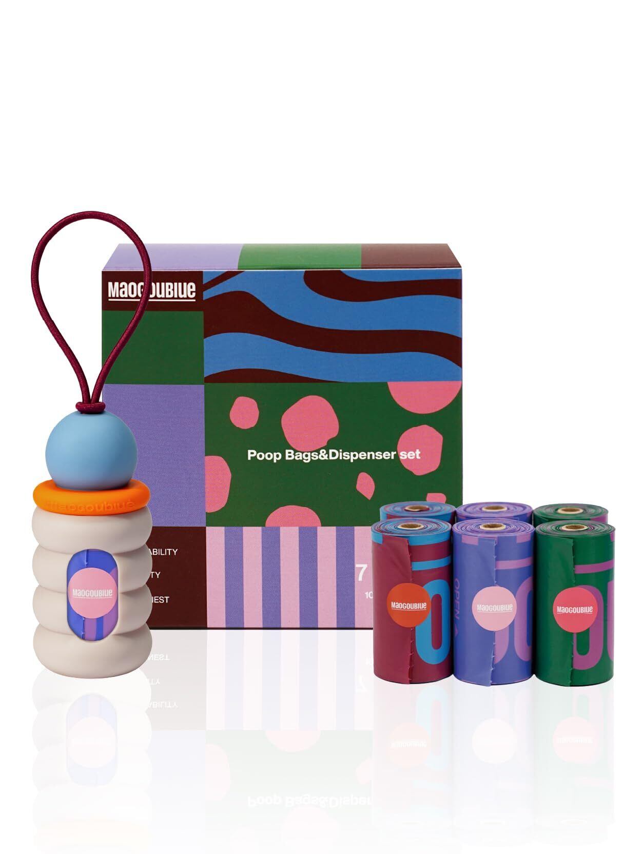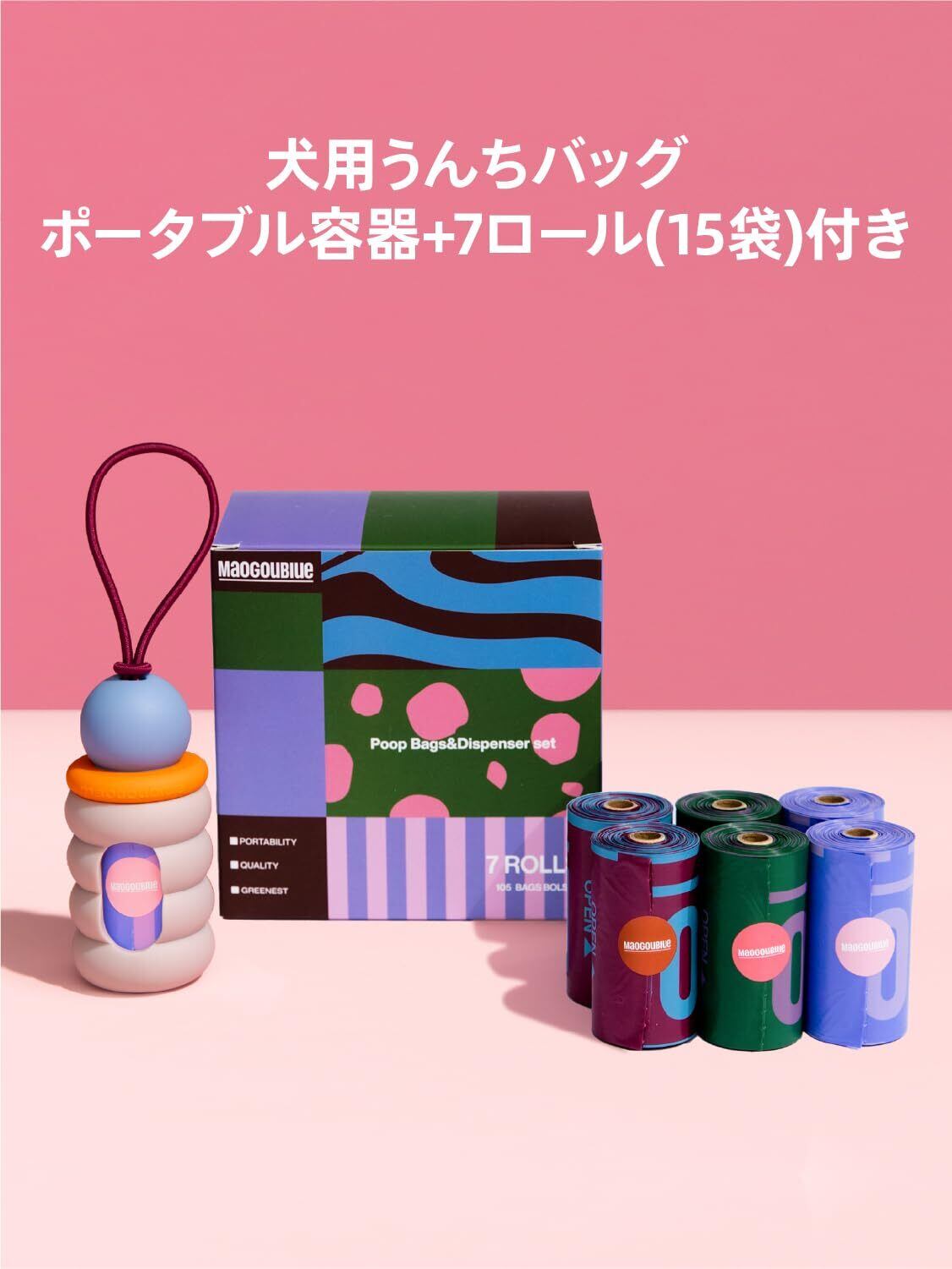 Maogoublue うんちが臭わない袋 犬うんち処理袋 におわない袋 生分解性 ジャスミンの香りつき 漏れ防止 極厚廃棄物袋 犬 散歩 マナー袋 サニタリー袋 お出かけ 車内 猫砂用 取り出し容器と首 (オフホワイト, ポータブル容器+7ロール(105袋)付き)