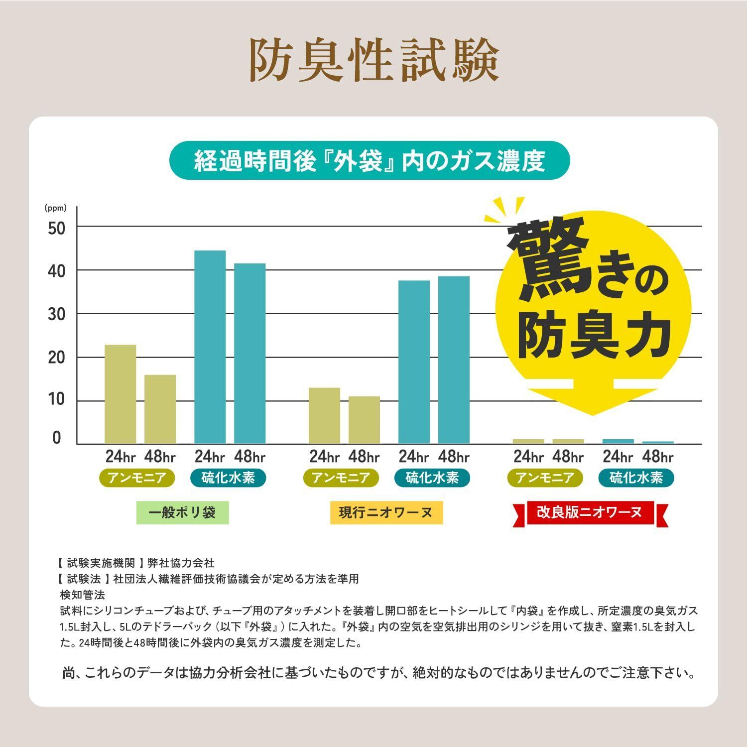 技術を採用した、業界トップクラスの驚異的な防臭効果!一般的なポリ袋と比較して約90%以上の臭気防臭性があります。(アンモニア、硫化水素の場合)