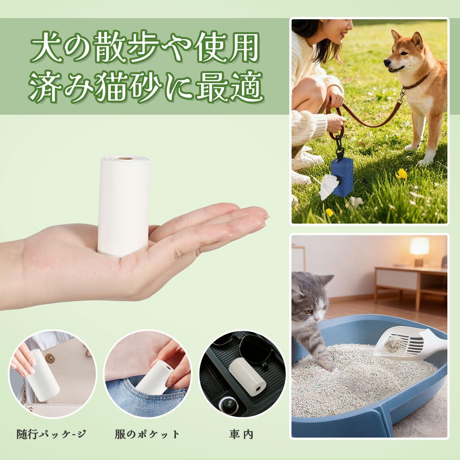 【多シーン高汎用性】 犬のうんち処理だけでなく、猫砂、ペット用オシッコシート、サニタリー用品の処分にも適用。家庭内の生ゴミ密封やトイレ常備にも最適で、ペットケアから日常雑用まで活用可能。