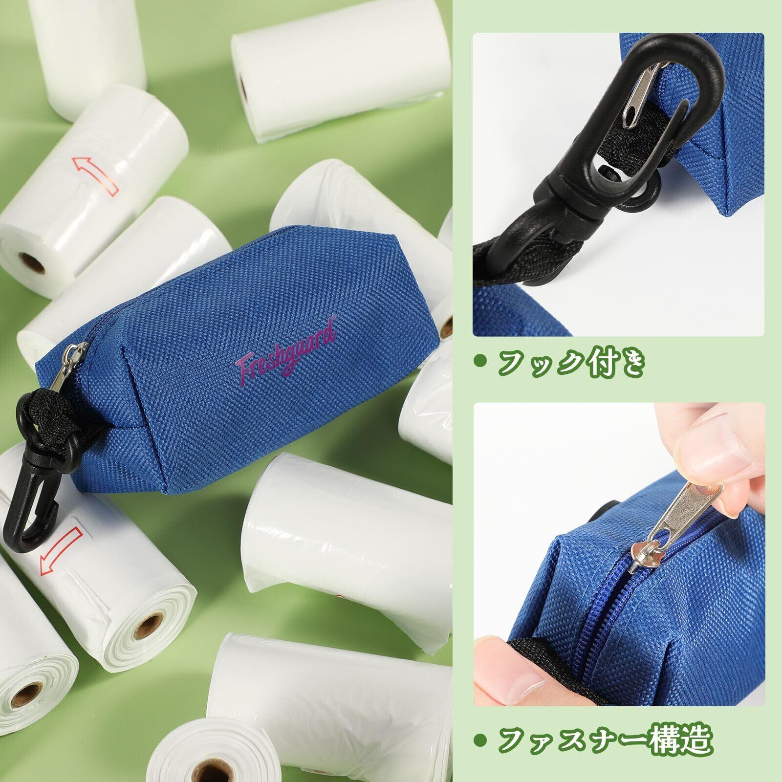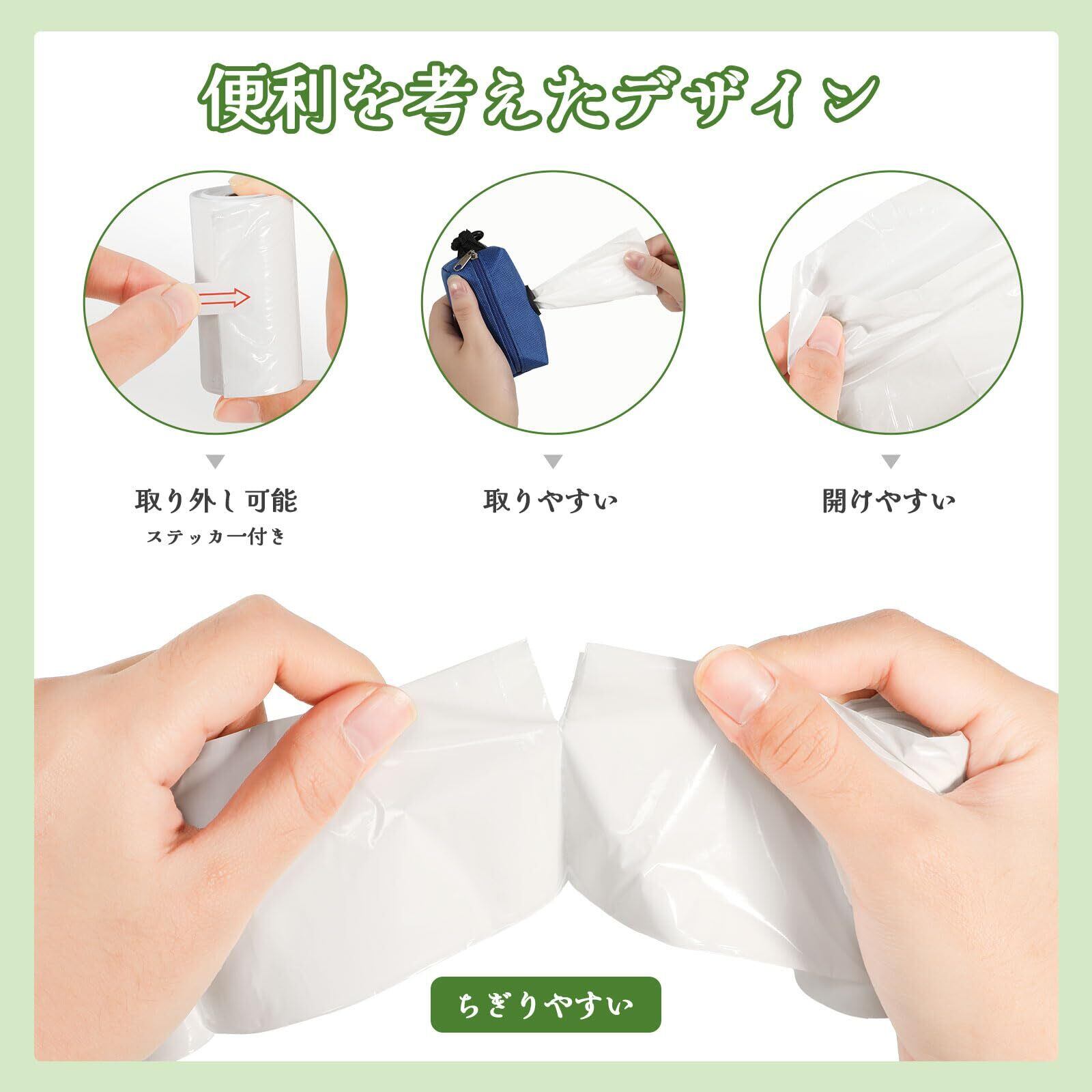 【コンパクト携帯便利】 ロールタイプの設計でポケットにスッと収まり、ディスペンサーに入れればリードやカバンに装着しても邪魔にならない。引き裂きミシン目が付いているため 1 枚ずつ簡単に取り出せ、お散歩時にいつでもすぐに使えて手間がかからない。