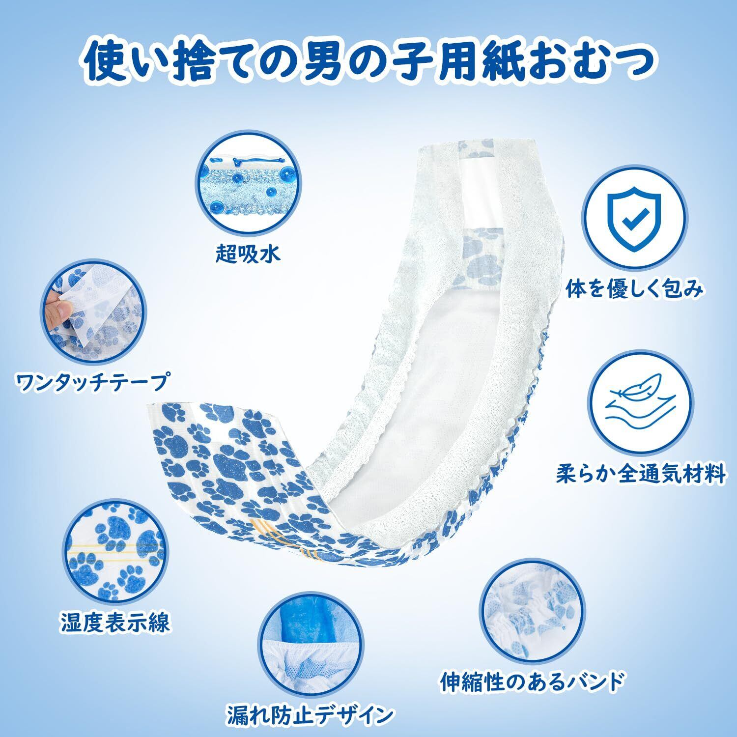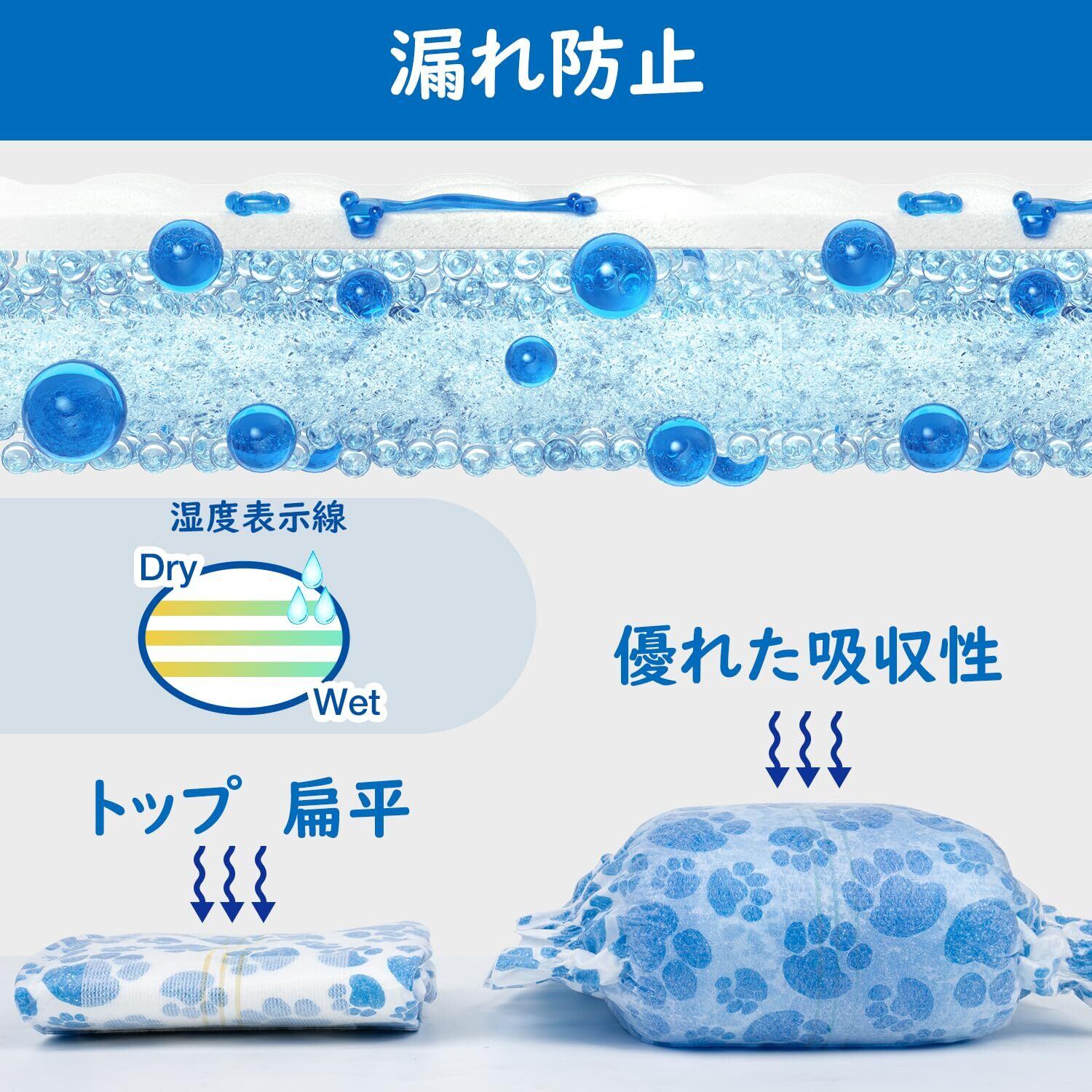 高吸収性:吸水紙、高分子吸収材を使用、吸収面積も広がり、あっという間に吸収ジェル状になり、吸水スピードが素早く、逆戻りしません。長時間オムツを変えないときもたっぷりのオシッコをしっかり吸収してくれます。肌にあたる部分なので、やさしい肌触りの通気性の素材を使用、全面でおしっこを吸収するからお肌はいつもさらさら