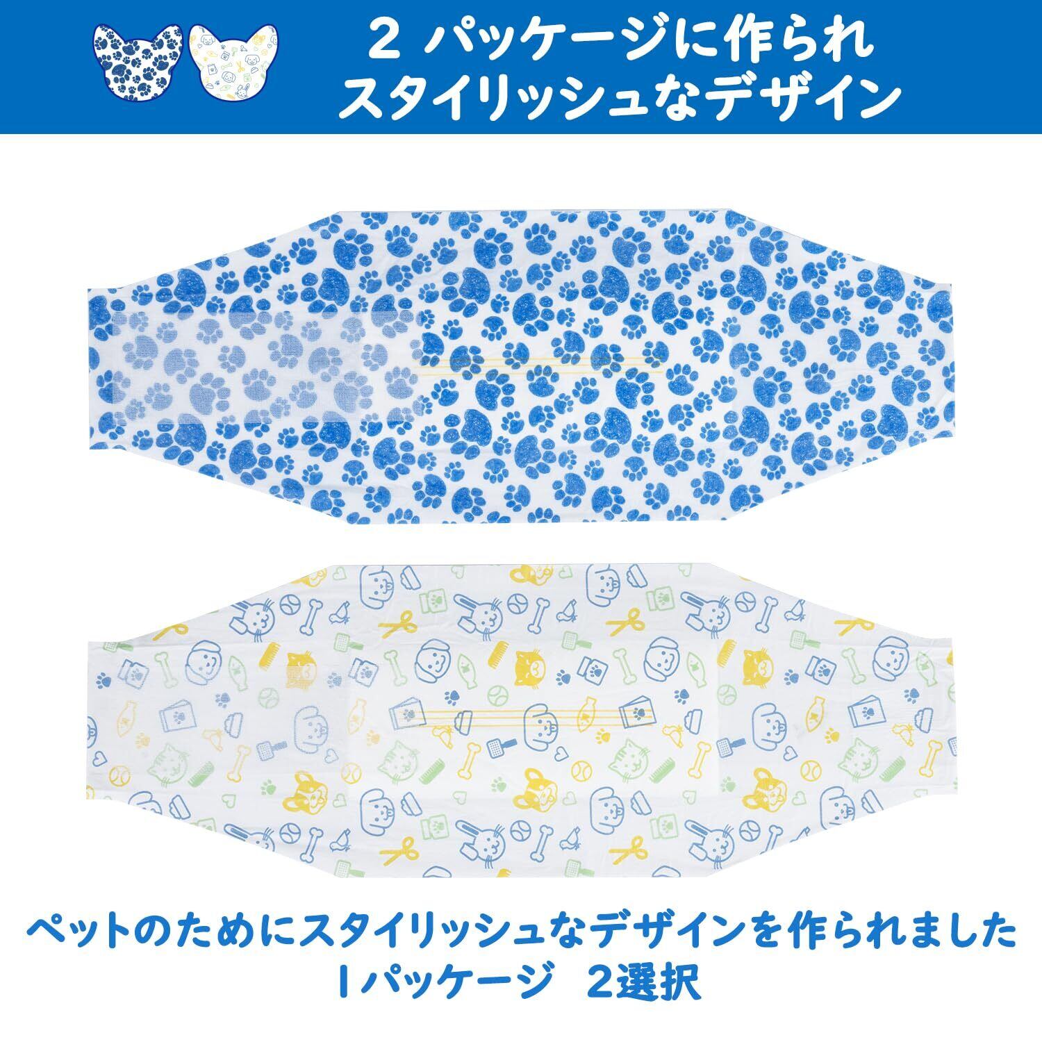1パックで2色:男の子用マナーおむつは2色柄のデザインをしました、同じパッケージの中に、オムツが2色入っています、パック毎に青い足柄10枚、かわいい動物柄10枚、爽やかな色が可愛くてご愛犬に似合います。
