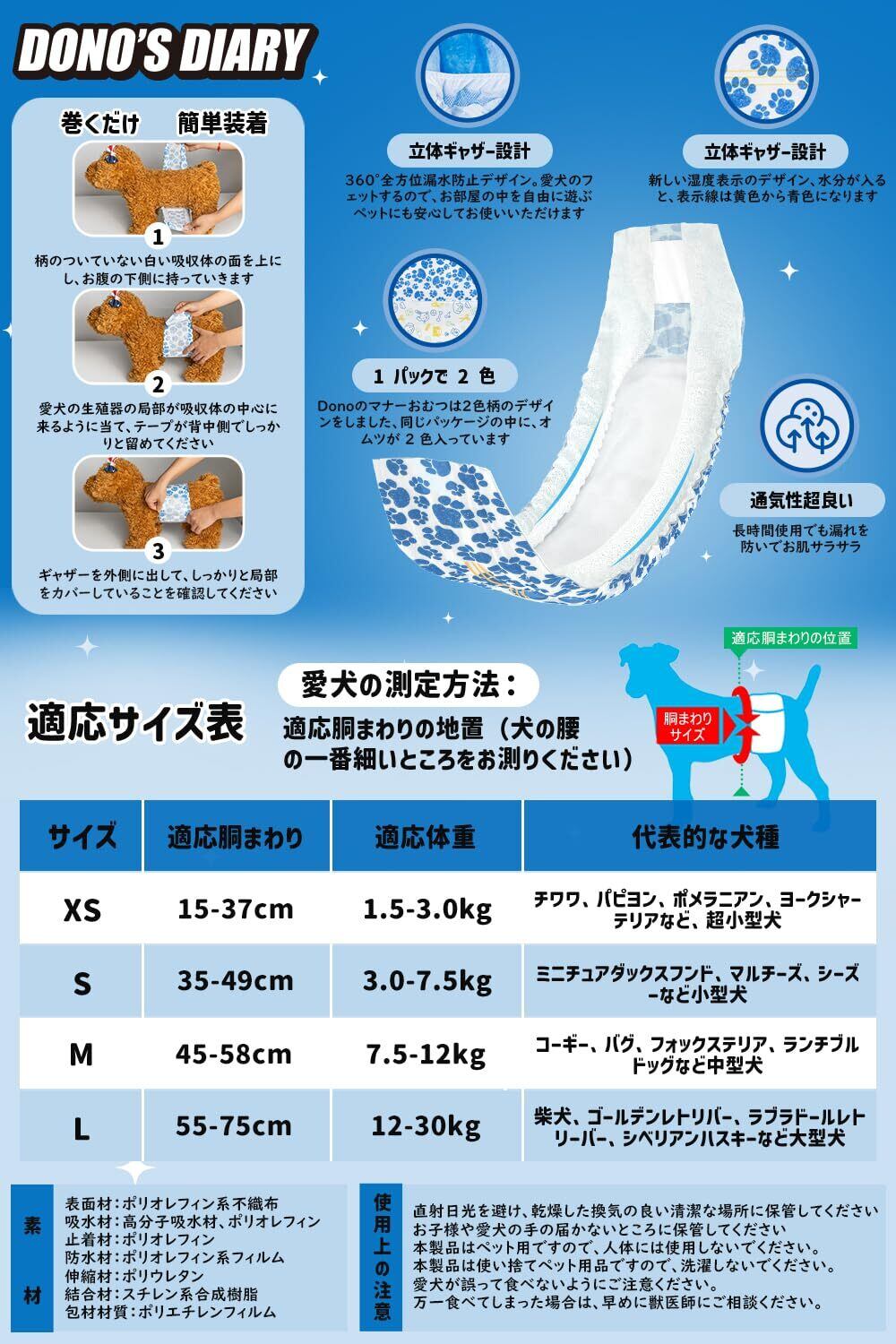 オムツの使用シーン:おもらし、マーキング防止、子犬のおしっこ対策、術後の介護、愛犬の生理、お出かけ時のマナー、お留守番にも使用できる、ワンタッチテープで何度もつけ直しでき、ペットの体型にフィットしていつも快適です。