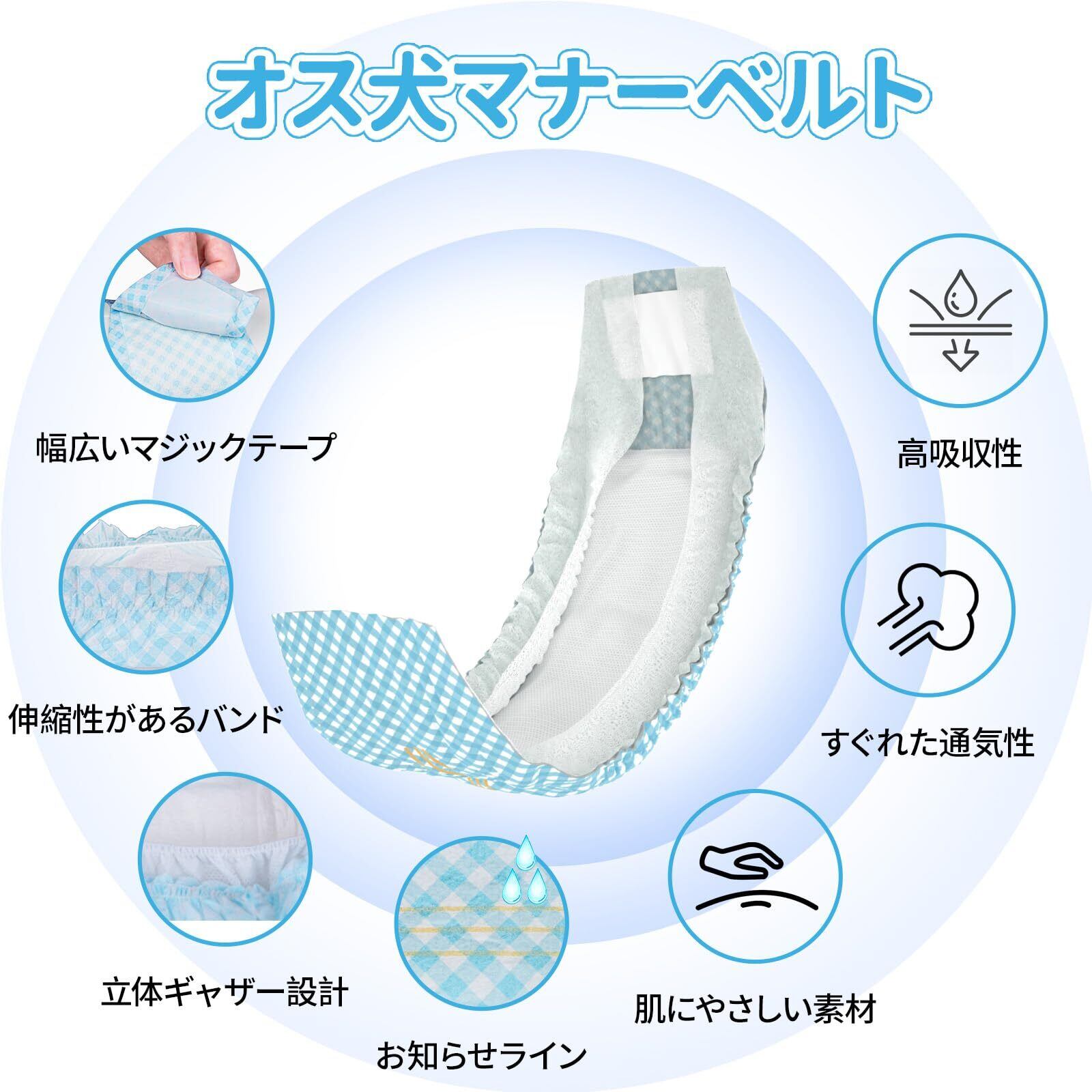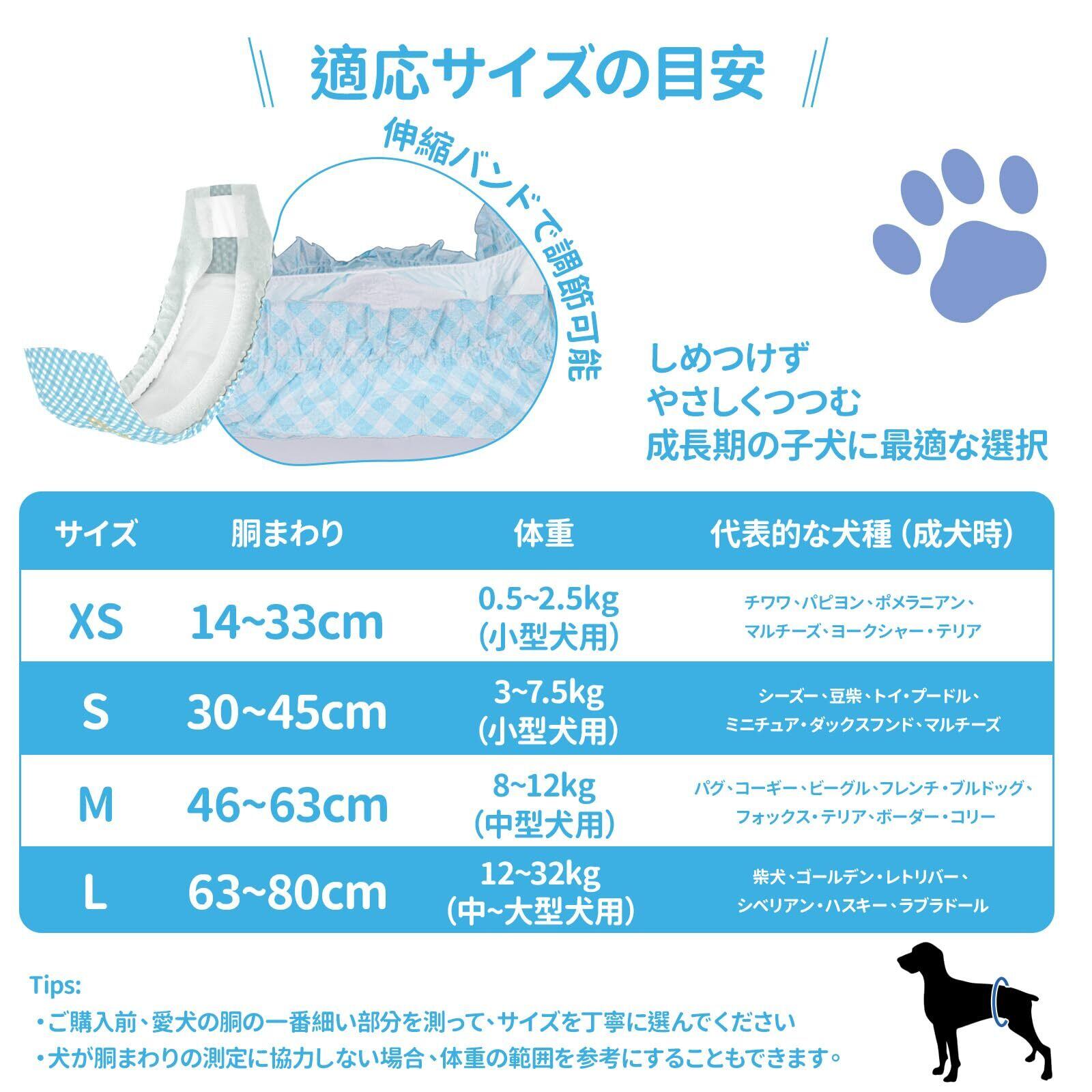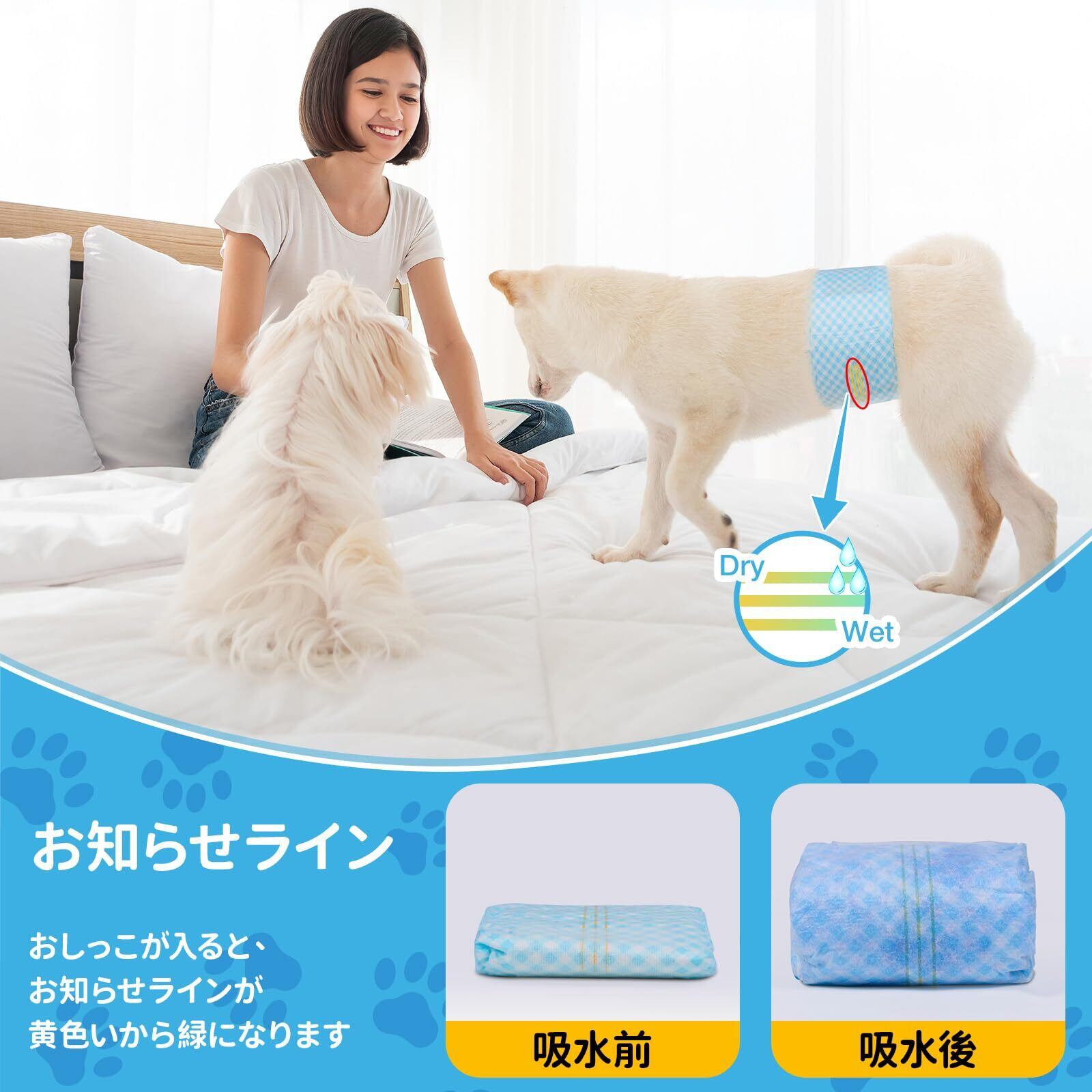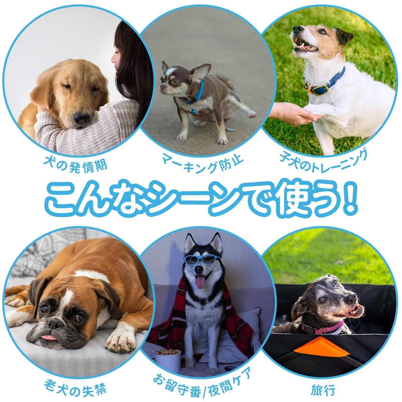 使用シーン:愛犬の発情やマーキング行為などに悩んてるとき、本製品が悩みを解決してくれます!あるいは、高齢犬の失禁問題、術後介護にも役に立てます。おでかけ時、お留守番中にも、飼い主の負担を軽減し、清潔を保ち、親子の楽しい気持ちを維持します。