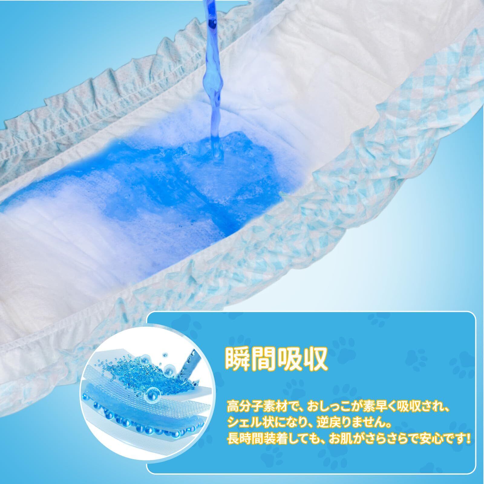 漏れ防止設計:本製品は高分子吸収材を採用したマナーパッドで、広い防漏縁付きの使い捨て紙おむつです。瞬間吸収ができるだけでなく、柔らかくて通気性も優れ、犬の肌を常にサラサラに保つことができて、ワンちゃんがサラサラに暮らします。