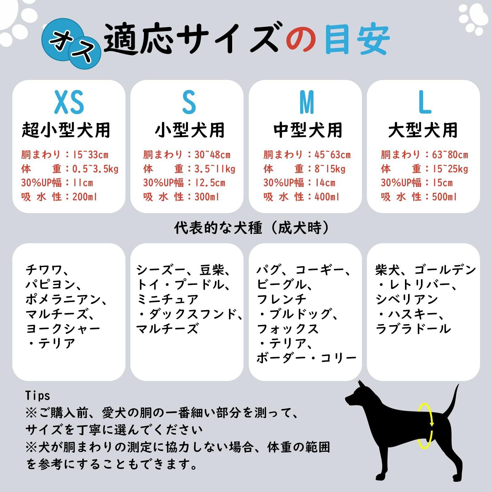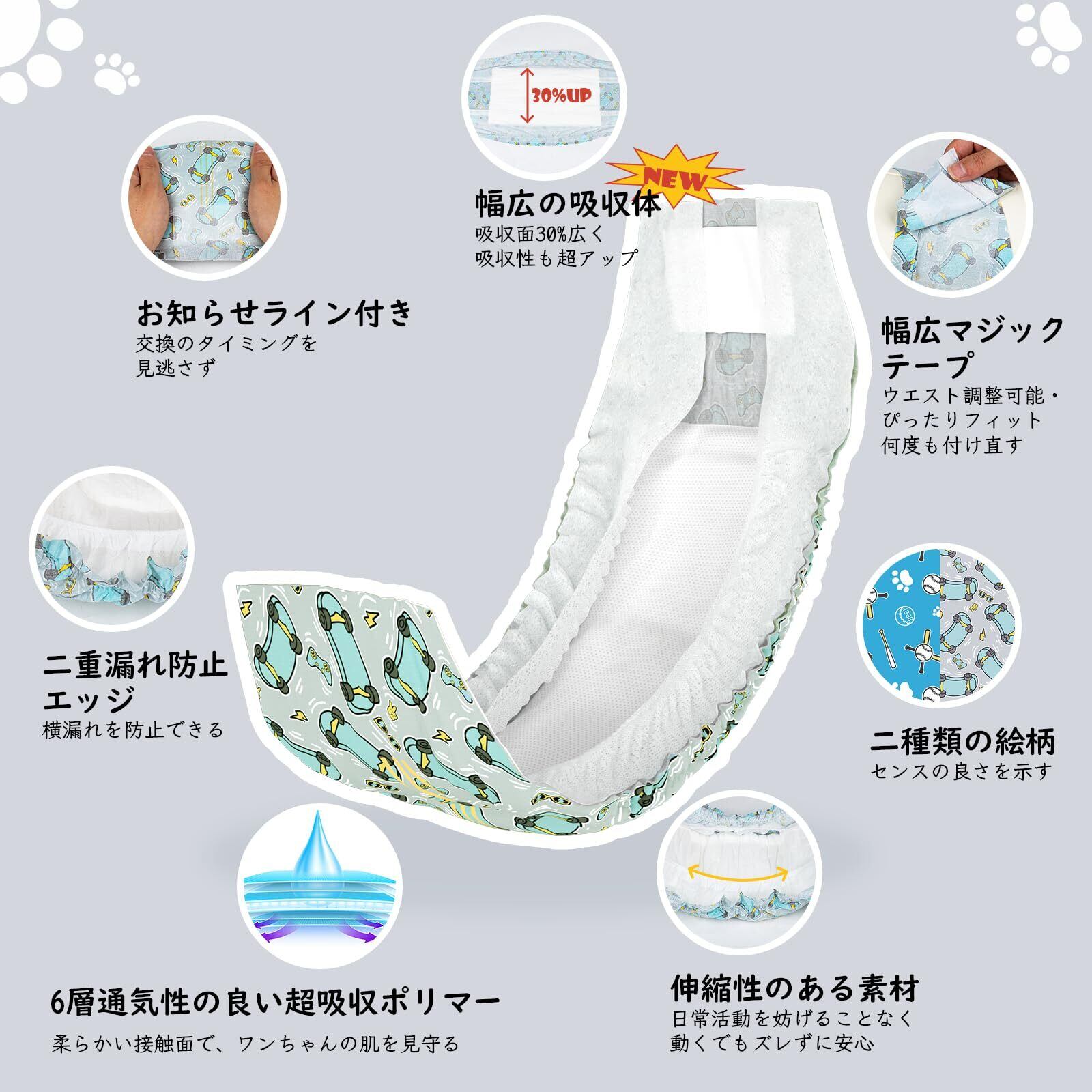使用シーン:愛犬の発情やマーキング行為などに悩んているとき、本製品が悩みを解決してくれます!高齢犬の失禁問題、術後の介護にも役に立ちます。吸収性が非常に高いため、頻尿や尿量が多い犬に最適です。おでかけ時、お留守番中にも、飼い主の負担を軽減し、清潔を保ち、親子が楽になります。