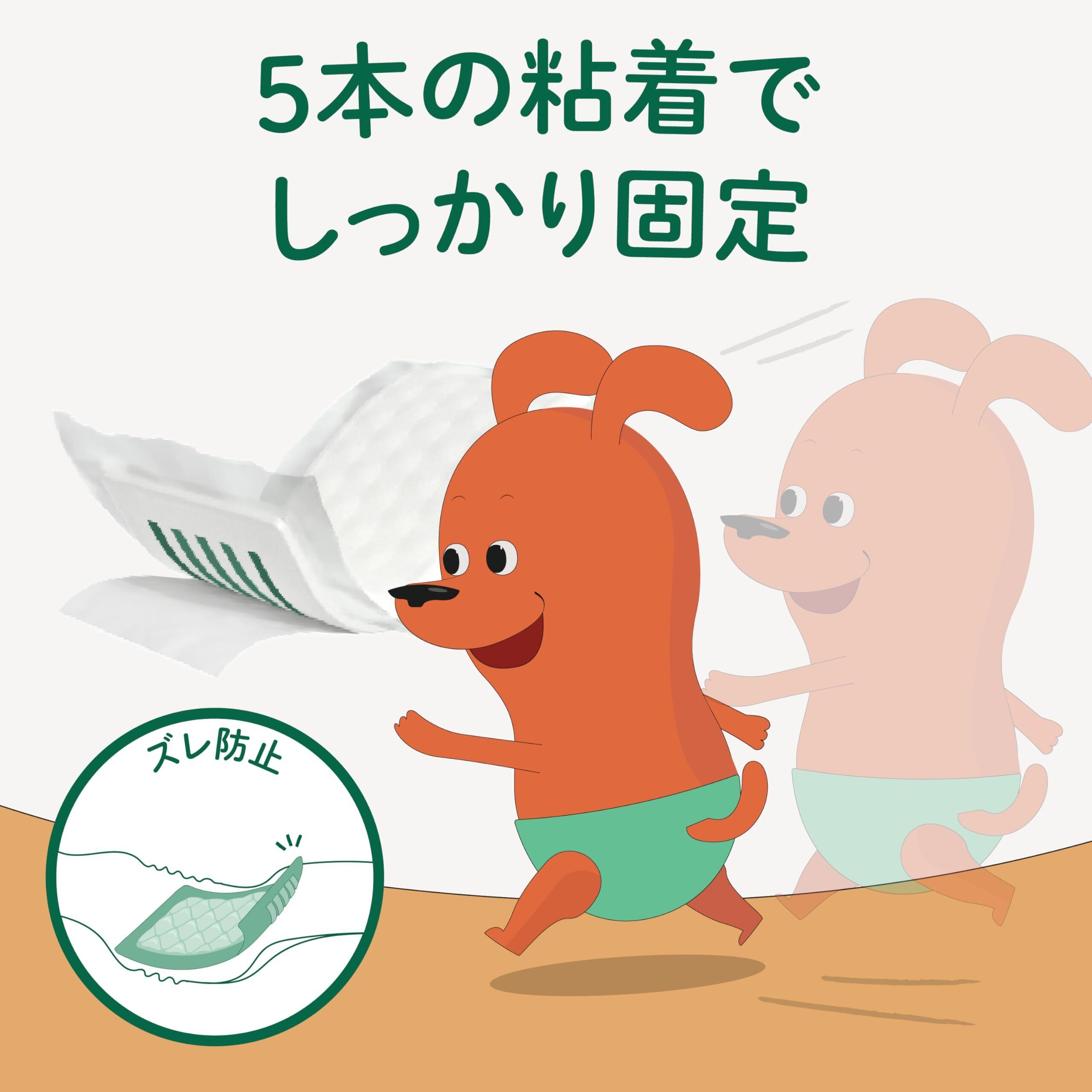 活発なワンちゃんでもズレにくい︕5本テープラインの独自仕様 : 他にはない5本のテープラインを採用し、おむつの中でもしっかりと固定。元気いっぱいに動き回っても、ライナーがズレたりめくれたりする心配がありません。