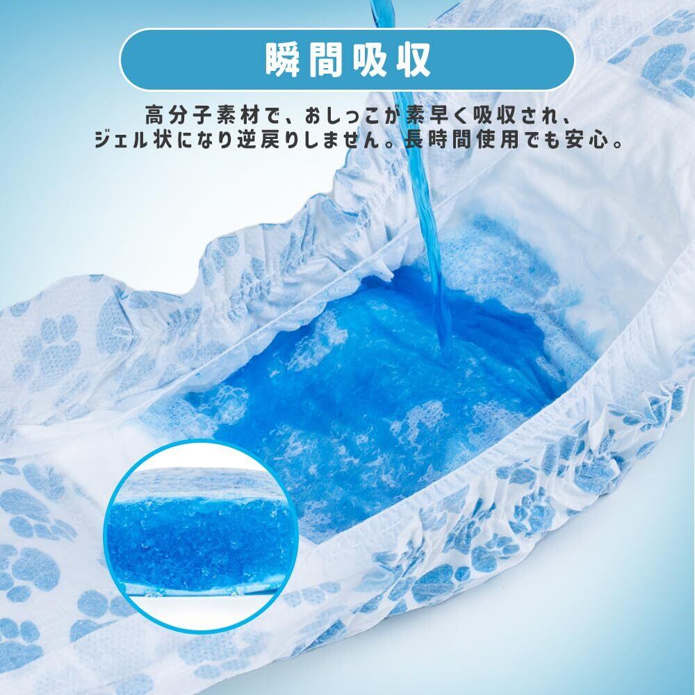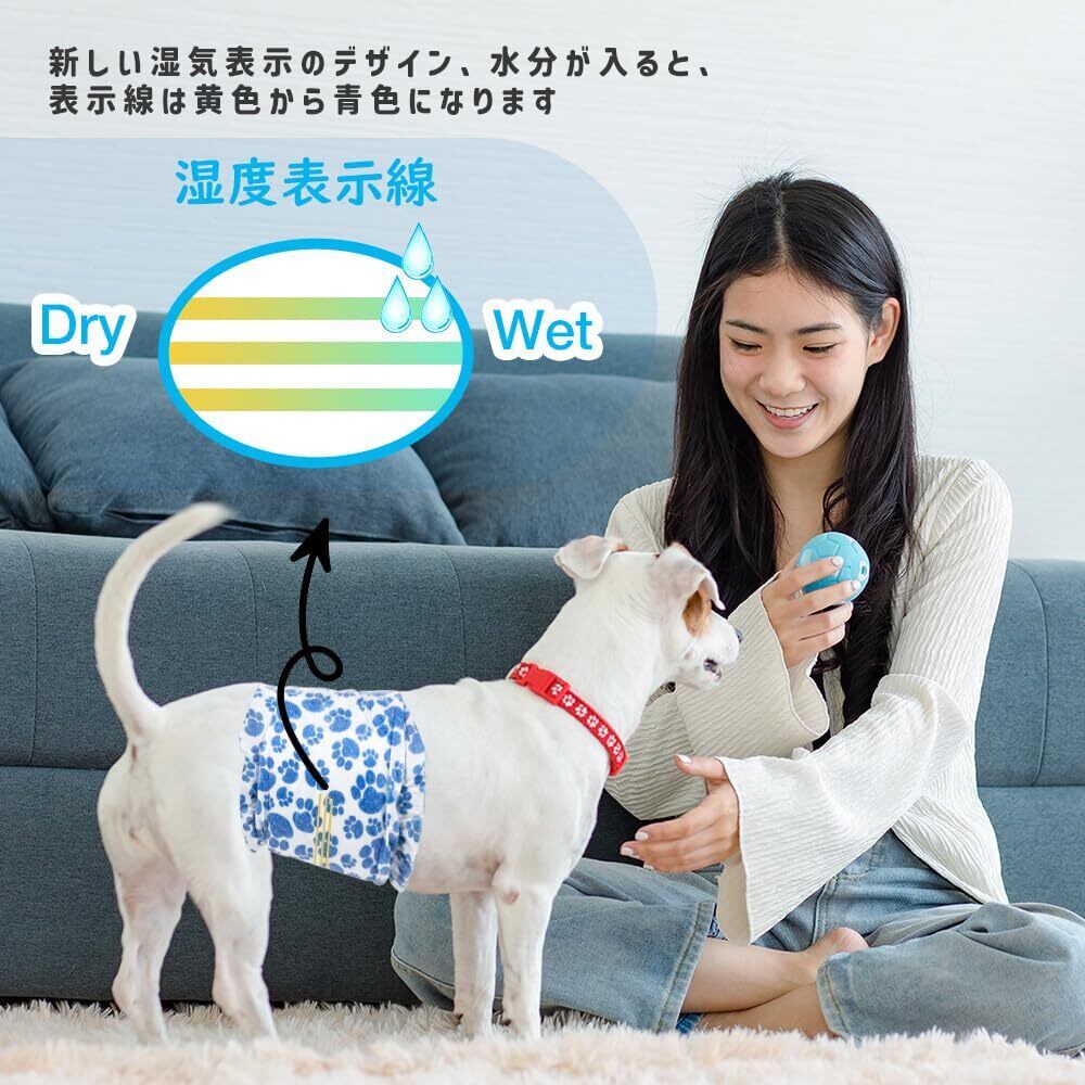 湿気表示線:おしっこしたら犬おむつの黄色のラインが青色に変わってお知らせしてくれてとても便利、取り替わる時間を飼い主にきっちり知らせます。簡単に使えるので、急に外出でも大丈夫です。