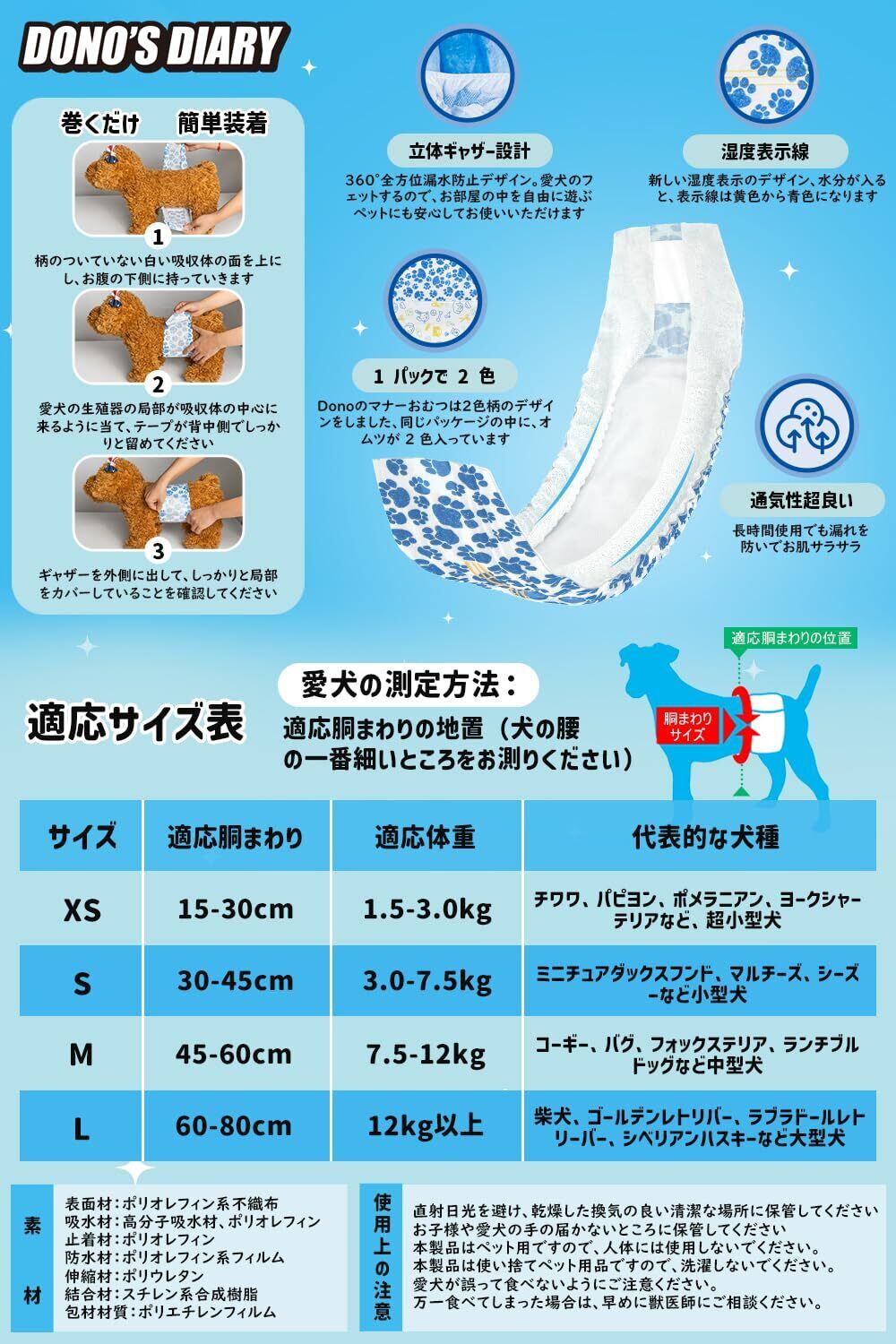Dono 犬おむつ 男の子用マナーベルト 長時間 高吸収 通気性 使い捨てタイプ犬オムツ 介護 おもらし対策 快適なおむつウェア 小型犬 中型犬 大型犬用紙オムツXSサイズ60枚