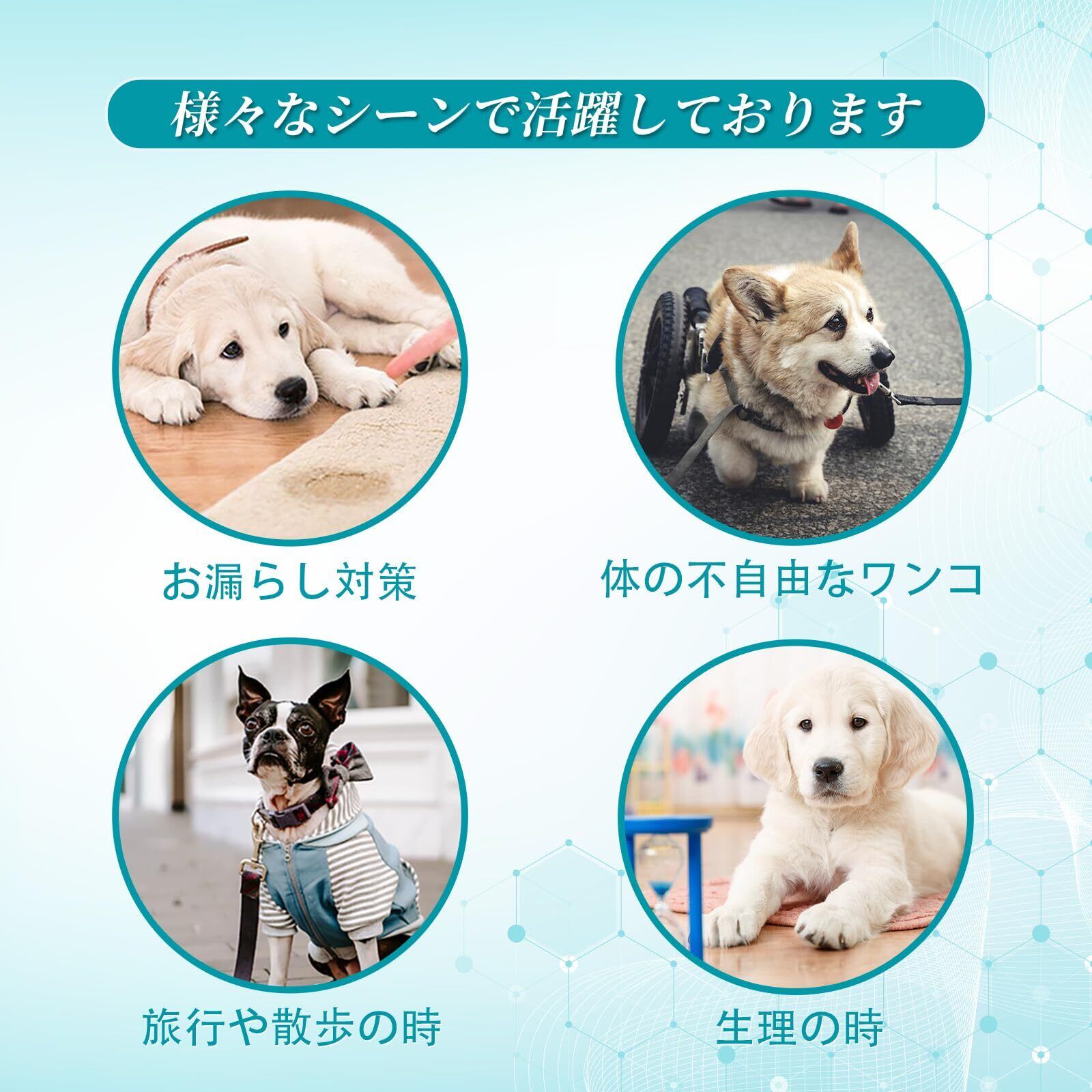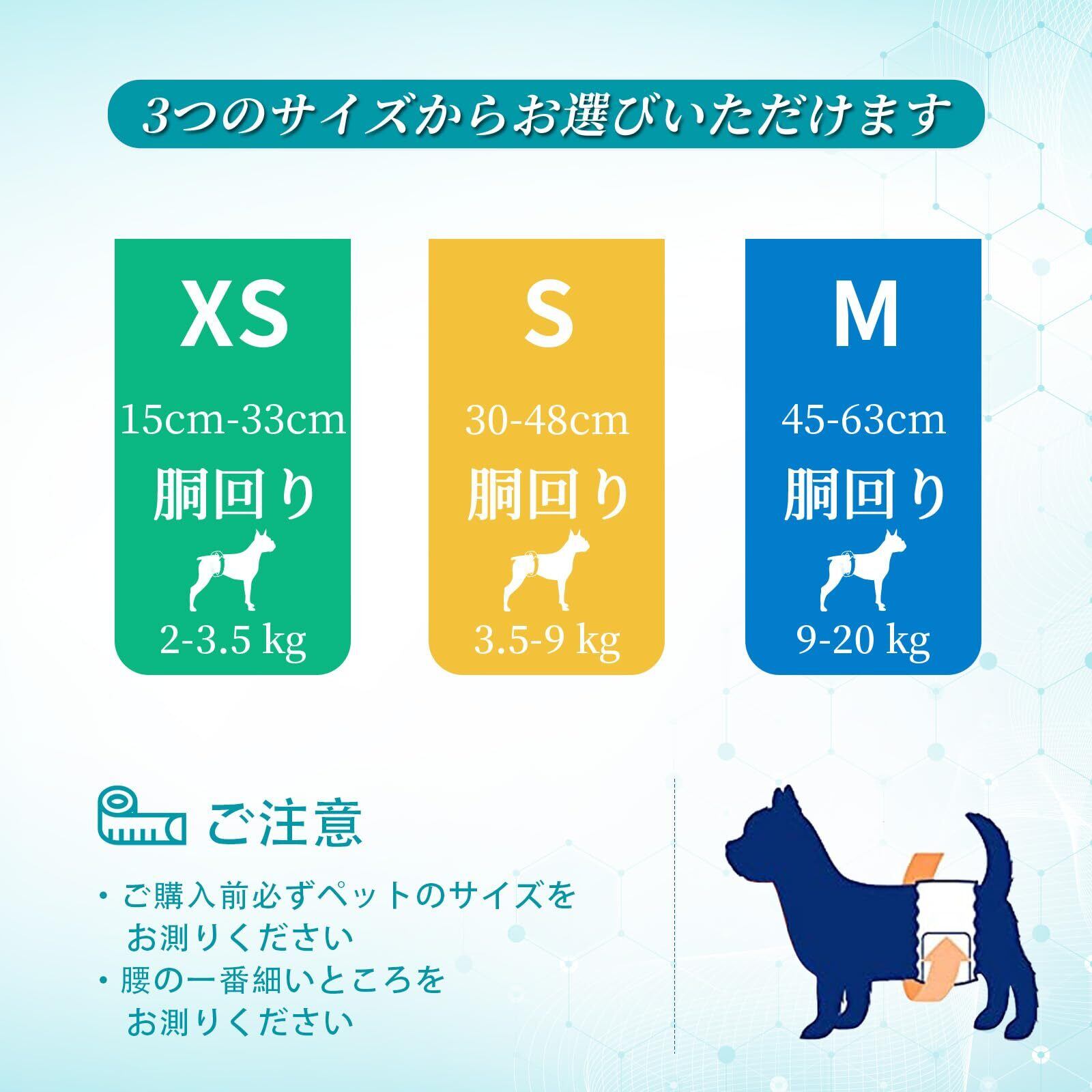 製品仕様:XS、S、Mの3つのサイズからお選びいただけます、ご購入前、必ずサイズ表で愛犬のサイズを確認してください、XS本体1枚のサイズ:約42x17.5x0.3cm、吸収部分約20x8cm、対応胴回り:約15-33cm、S本体1枚のサイズ:約53×20×0.3cm、吸収部分約20x10cm、対応胴回り:約30-48cm、M本体1枚のサイズ:約65×20×0.3cm、吸収部分約:20x10cm、対応胴回り:約45-63cm、マジックテープ式なので、固定用のマジックテープは大きくて、愛犬に適切なサイズに調整できます、伸縮性の縁で、わんちゃんの動きにもピッタリフィットします