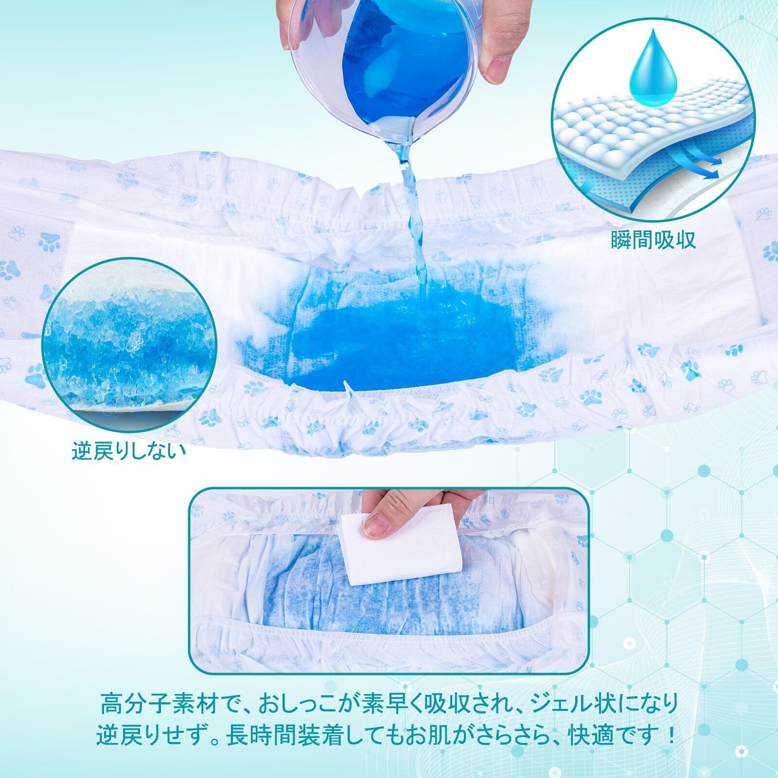 吸水性ダントツ:ワンちゃん本来の柔軟な動きを妨げないように配慮した設計に基づいて、柔らかいコットン素材で、厚さ0.3cmだけで超薄型ライナー、立体モレ防止ギャザー、 オシッコをしっかりガード、動いてもズレにくい、おしっこをちゃんとカバーしてモレを防ぎます。