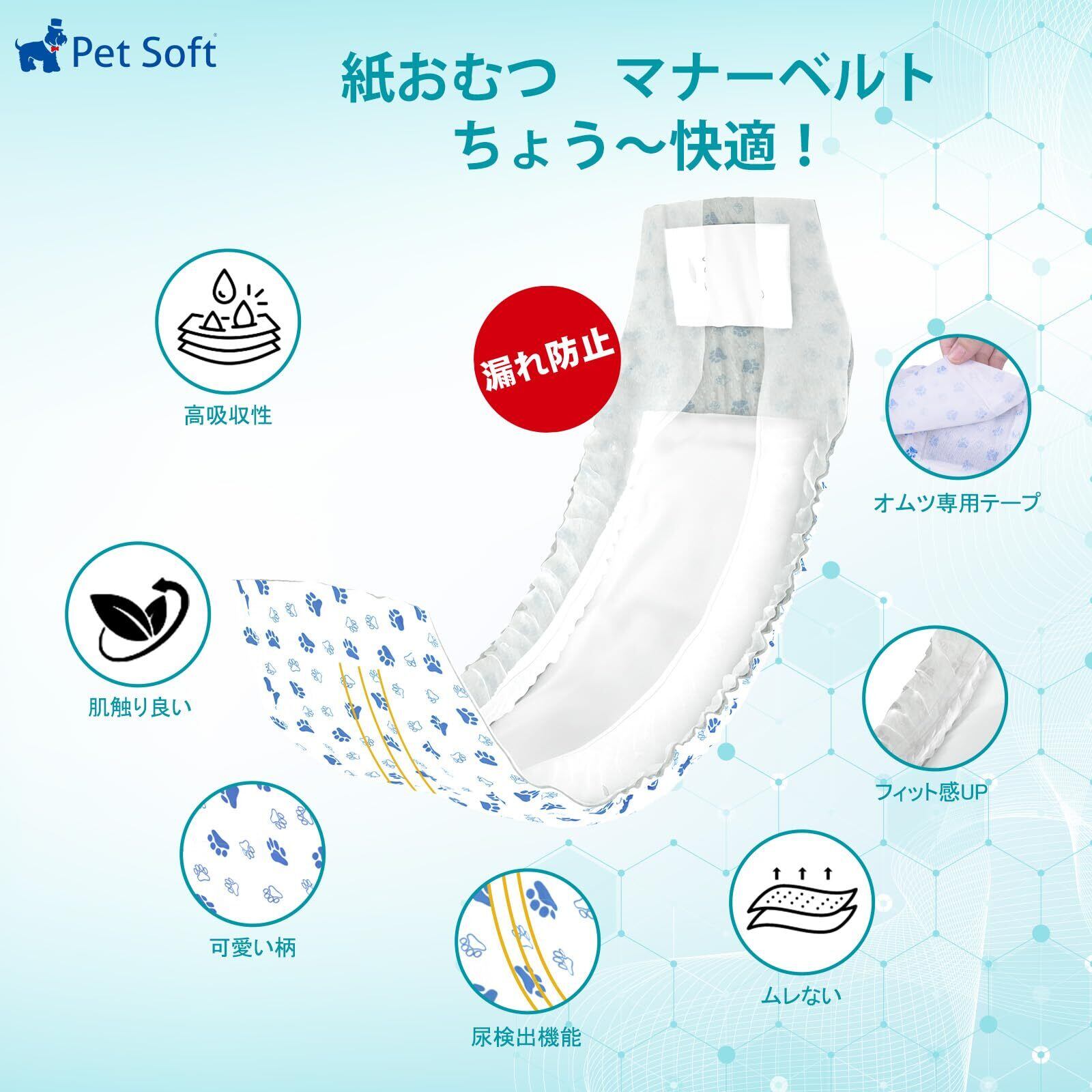 通気性抜群・快適:Pet Softのおむつはワンちゃんに合わせたデザインで、ぴったりフィット、お腹に巻くだけ、簡単装着で裏地に通気性の高いメッシュ素材が 使われており、暑い夏場でも蒸れを防ぐことができます、おしっこのムレを逃がす、全面通気で絹のような優しい肌触りでふわさら吸収ライナーを採用し、長時間使用でもムレを防いでお肌さらさら