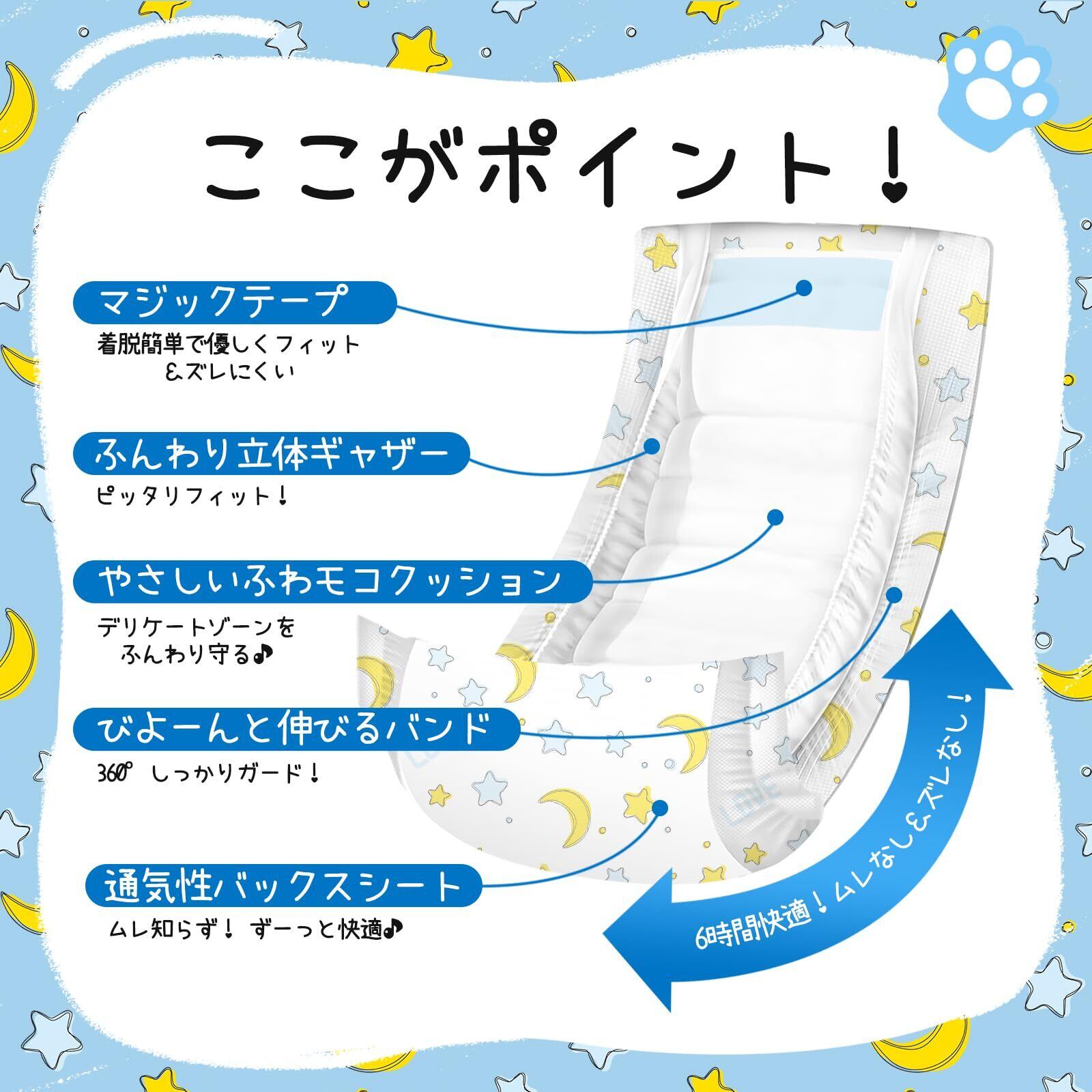 ●ポイント④|長時間でも安心の6時間ロングガード スリムなのに吸収力バツグン! 高吸収ポリマーがたっぷりの尿を6時間しっかりキャッチ。 お出かけやお留守番も、これ1枚で安心です。