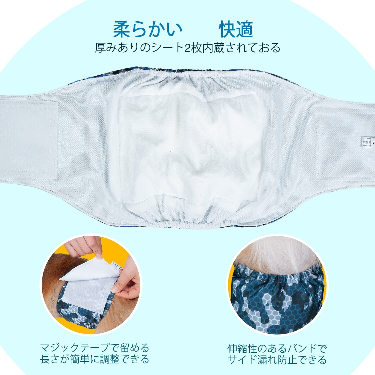【肌に優しい&使いやすい】:内側はメッシュ素材で通気性がよく、着心地も柔らかいです。肌に優しいポリエステルで作りました犬おむつですが、ペットには快適です。お腹に巻くだけで簡単装着なので、使いやすいです。