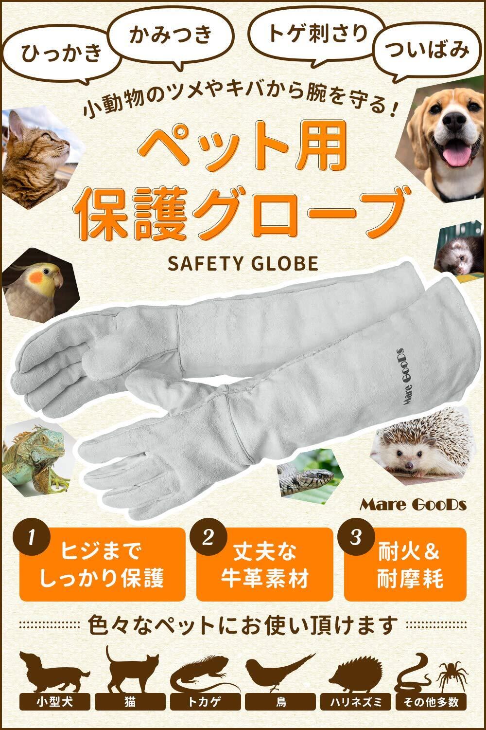 【飼い主の腕全体を保護】ひっかきやかみつき、トゲ刺さり、ついばみから腕を保護するのに役立つ手袋です。ペットの訓練やシャワー、爪を切る、薬を飲ませるなど、ペットが抵抗するときにも、活躍します。手袋よりも広い面積をガードしてくれる、全長約50cmのロングサイズ。指先から肘まで腕全体をしっかりと守ります。また、自分の爪で大切なペットを傷つけてしまう心配もありません。グローブがあることで、安心してペットと触れ合え、安全にコミュニケーションをとることができます。